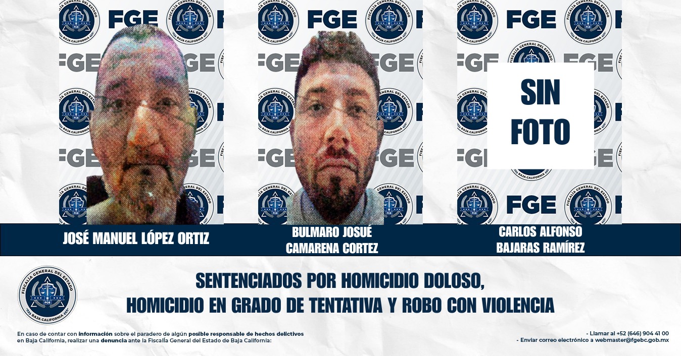 TIJUANA, BAJA CALIFORNIA. - La Fiscalía Regional de Tijuana, a través de la Coordinación de Averiguaciones Previas y Control de Proceso, obtuvo sentencia condenatoria en contra de José Manuel López Ortiz, alias “El Gordo” alias “El Viejo”; Bulmaro Josué Camarena Cortez, alias “El Zimba” alias “El Parejón” alias “El Amarillo”; y de Carlos Alfonso Bajaras Ramírez, alias “El Cholo” alias “El Orejón” alias “El Poncho” por su responsabilidad penal en los delitos de homicidio doloso, homicidio en grado de tentativa y robo con violencia.