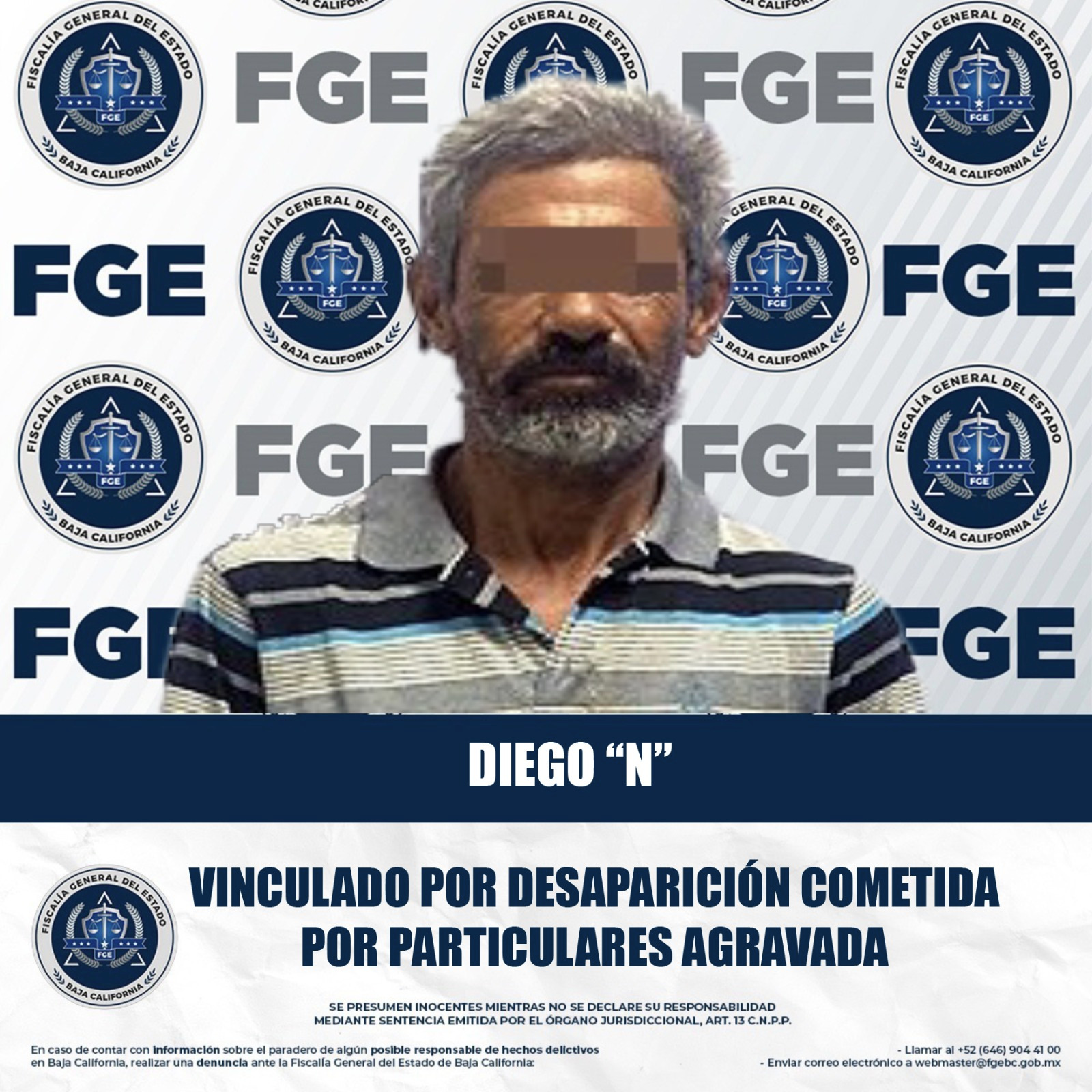 MEXICALI, BAJA CALIFORNIA. - La Fiscalía General del Estado, a través de la Fiscalía Especializada en Delitos Contra la Vida, obtuvo la vinculación a proceso de un hombre acusado del delito de desaparición cometida por particulares agravada.