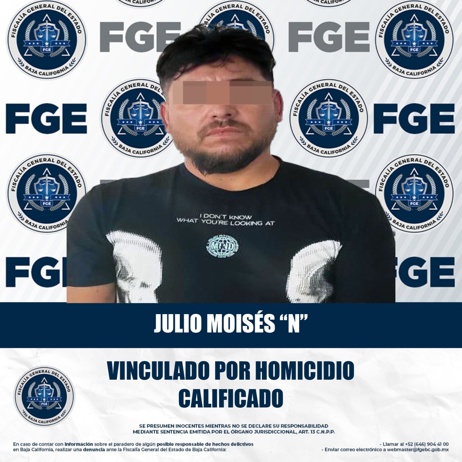 ENSENADA, BAJA CALIFORNIA. - La Fiscalía General del Estado obtuvo la vinculación a proceso en contra de Julio Moisés “N”, por su probable responsabilidad en el delito de homicidio calificado, ocurrido en San Quintín.