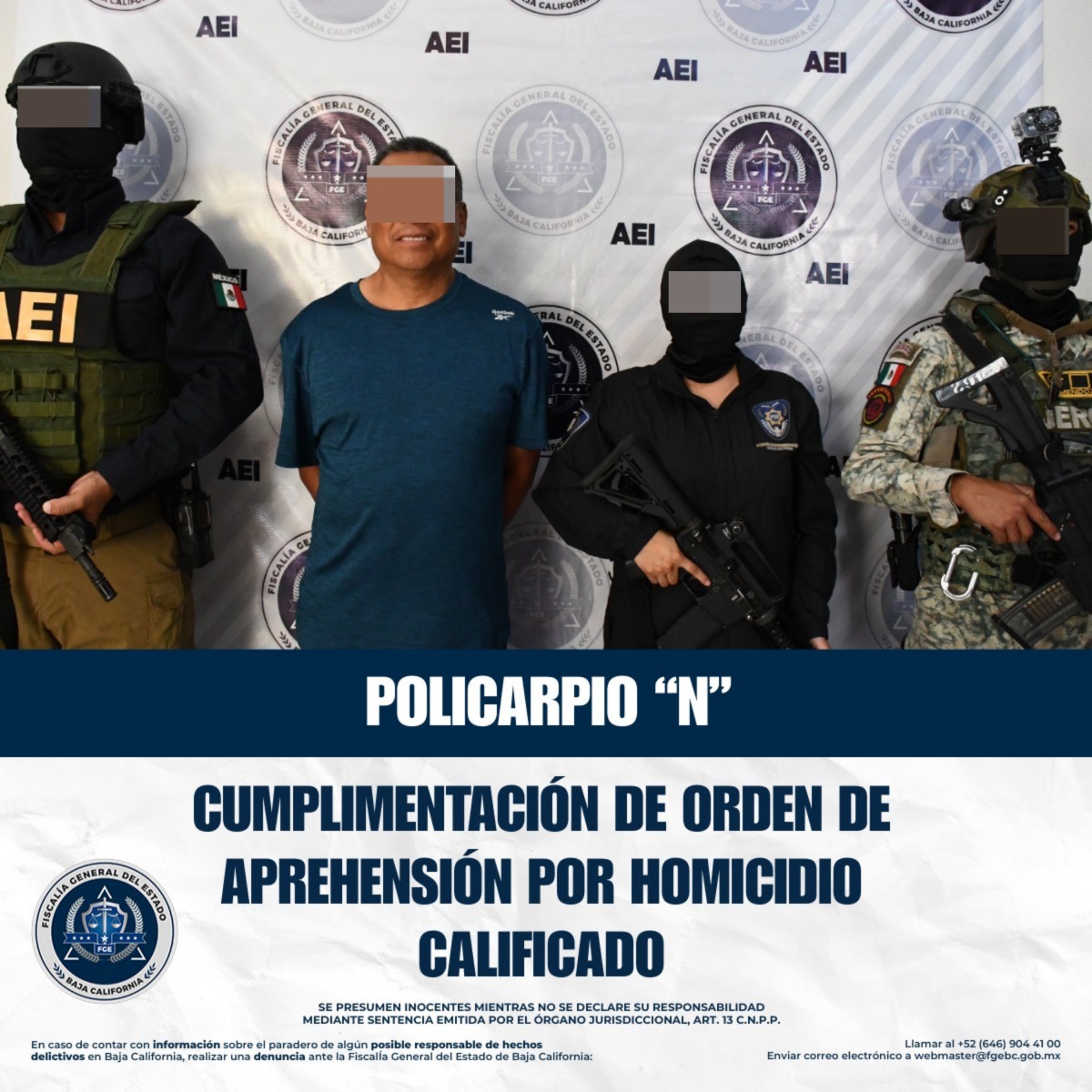 TIJUANA, BAJA CALIFORNIA. - Bajo las directrices de la Fiscal General del Estado, Dra. Ma. Elena Andrade Ramírez, de colaborar de manera interinstitucional, la Unidad Especializada en Delitos Contra la Vida logró cumplimentar la orden de aprehensión en contra de Policarpio “N”, originario de Hidalgo, quien contaba con un mandamiento judicial vigente en Ciudad de México por el delito de homicidio calificado.