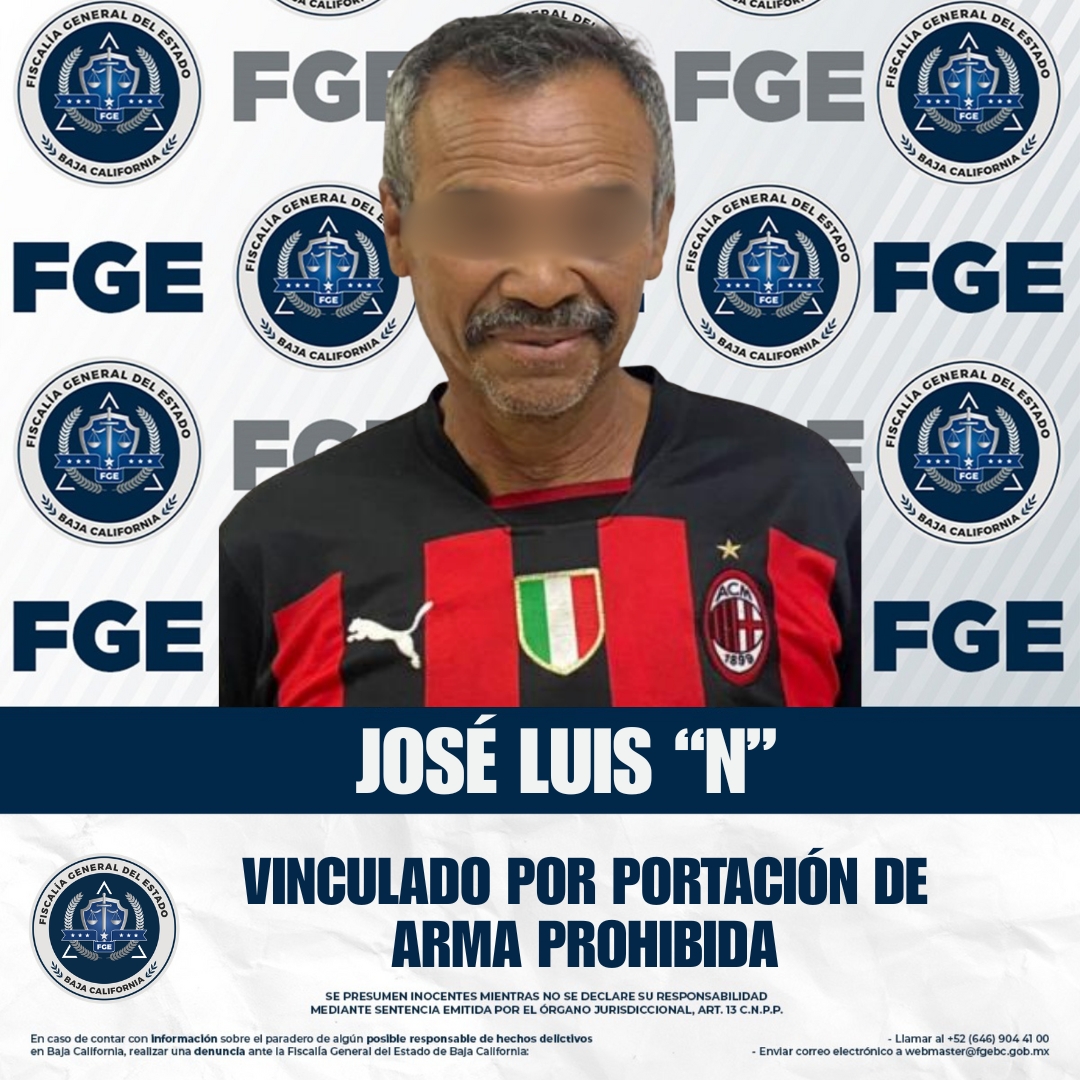 SAN QUINTÍN, BAJA CALIFORNIA. - La Fiscalía Regional de San Quintín logró la vinculación a proceso de José Luis “N” por el delito de portación de arma prohibida, luego de ser detenido en la colonia Praderas, delegación San Quintín.