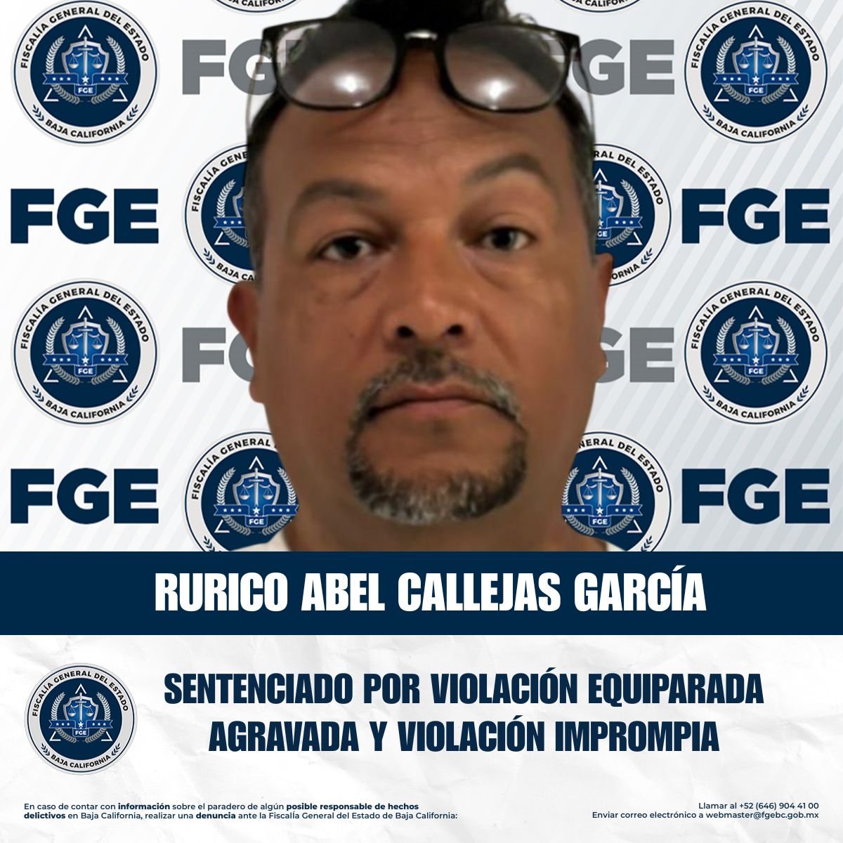 PLAYAS DE ROSARITO, BAJA CALIFORNIA. - La Fiscalía General del Estado, bajo las instrucciones de la Dra. Ma. Elena Andrade Ramírez, de llevar ante la justicia a todo aquel que cometa un ilícito, informa que a través de las labores investigativas de la Fiscalía Especializada en Delitos Contra la Mujer por Razón de Género y la unidad de investigación de delitos cometidos contra la libertad sexual y la familia de la ciudad de Playas de Rosarito, se logró la sentencia condenatoria en contra de Rurico Abel Callejas García, por su responsabilidad en los delitos de violación equiparada agravada y violación impropia.