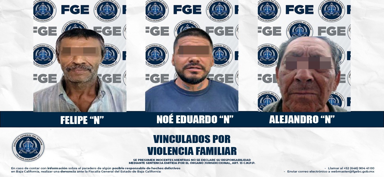 MEXICALI, BAJA CALIFORNIA. - La Fiscalía Regional de Mexicali, a través de la Unidad de Investigación de Delitos con Detenidos Oriente y Detenidos Poniente, obtuvo la vinculación a proceso de tres hombres imputados por el delito de violencia familiar.