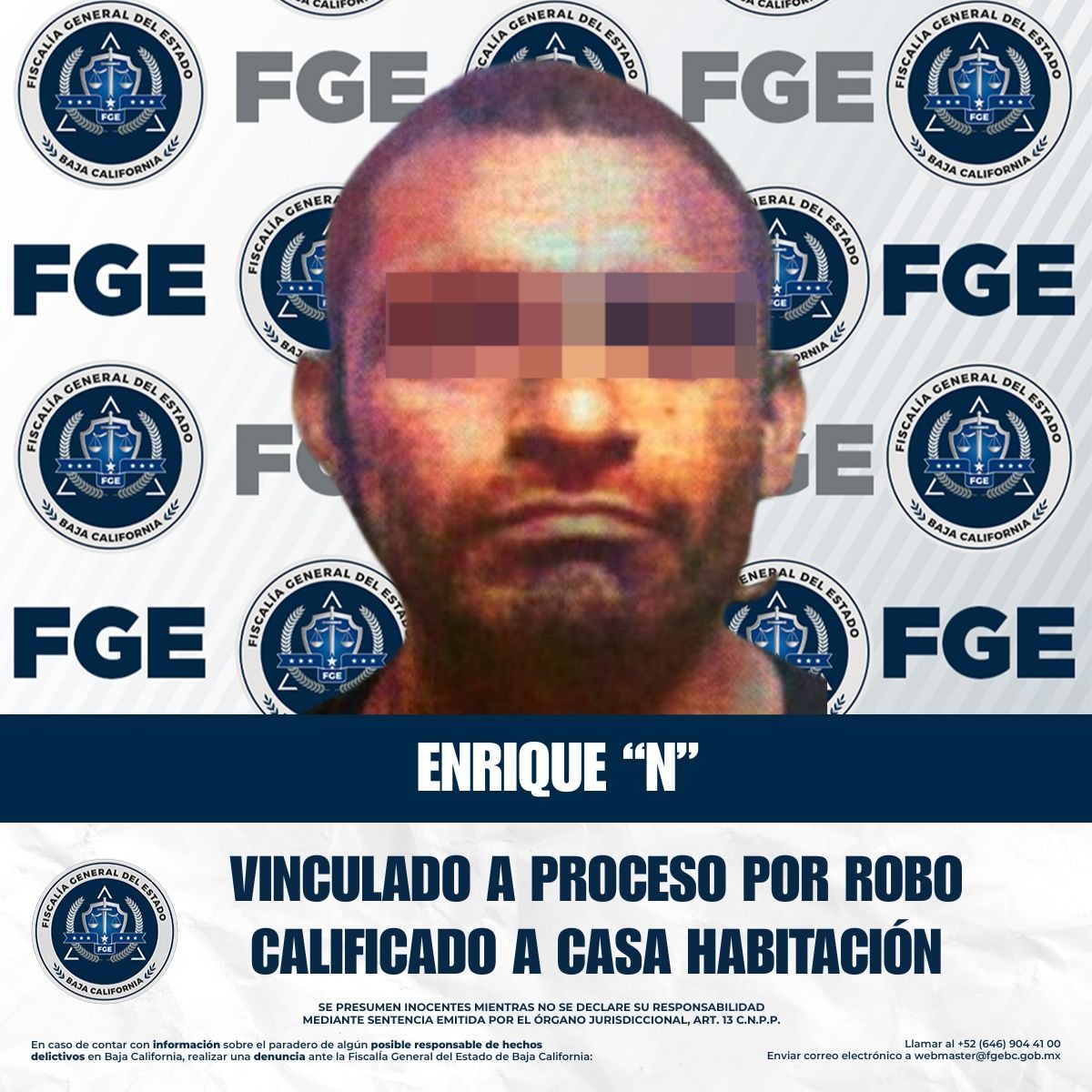 TIJUANA, BAJA CALIFORNIA. - La Unidad de Investigación Especializada en Robos La Mesa, adscrita de la Fiscalía Regional de Tijuana, obtuvo la vinculación a proceso de Enrique “N”, por el delito de robo calificado a casa habitación.