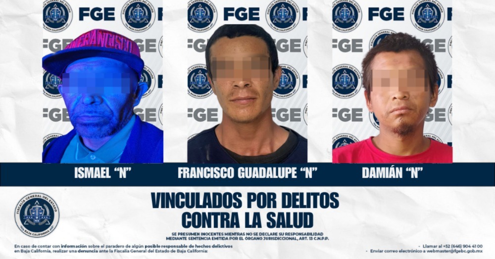ENSENADA, BAJA CALIFORNIA. - La Fiscalía General del Estado, a través de la Fiscalía Especializada en Narcomenudeo, obtuvo vinculación a proceso contra tres hombres detenidos en distintos puntos de la ciudad por su presunta participación en delitos contra la salud en la modalidad de narcomenudeo. En todos los casos, el Juez de Control impuso la medida cautelar de prisión preventiva justificada.