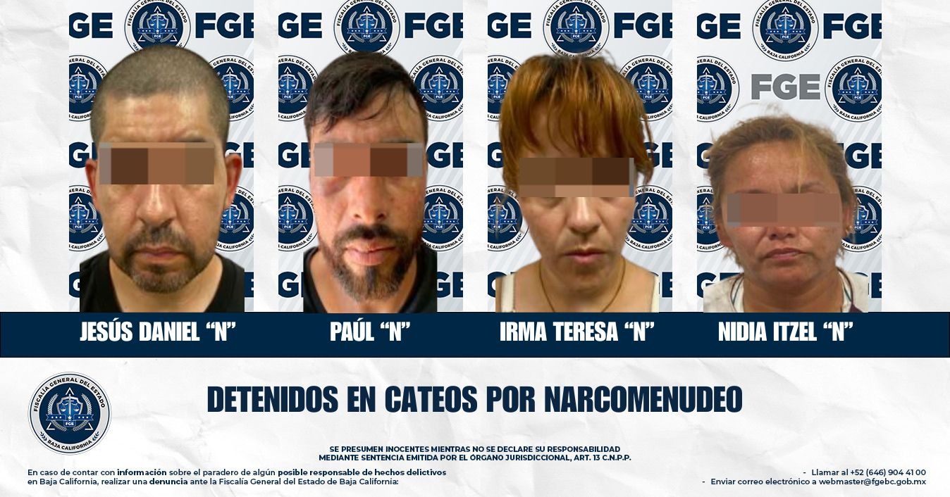 PLAYAS DE ROSARITO, BAJA CALIFORNIA. - Cuatro personas fueron detenidas por agentes de la Fiscalía General del Estado, tras la realización de tres cateos en los que se localizaron distintas cantidades de droga.