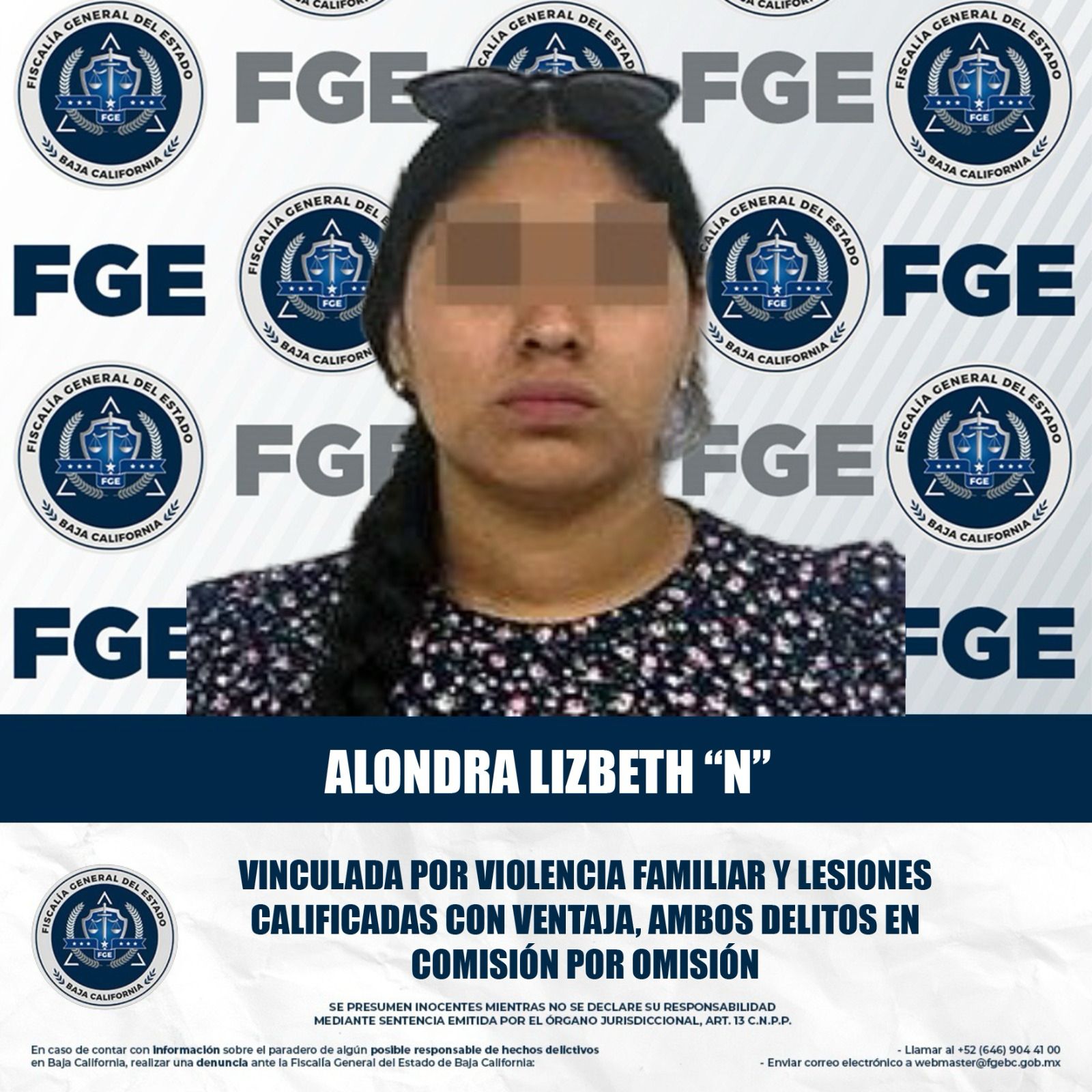 TECATE, BAJA CALIFORNIA. - La Fiscalía General del Estado (FGE), a través de la Fiscalía Especializada en Delitos contra Mujeres por Razón de Género, obtuvo la vinculación a proceso de Alondra Lizbeth “N”, de 20 años, por los delitos de violencia familiar y lesiones calificadas con ventaja, ambos cometidos por omisión.