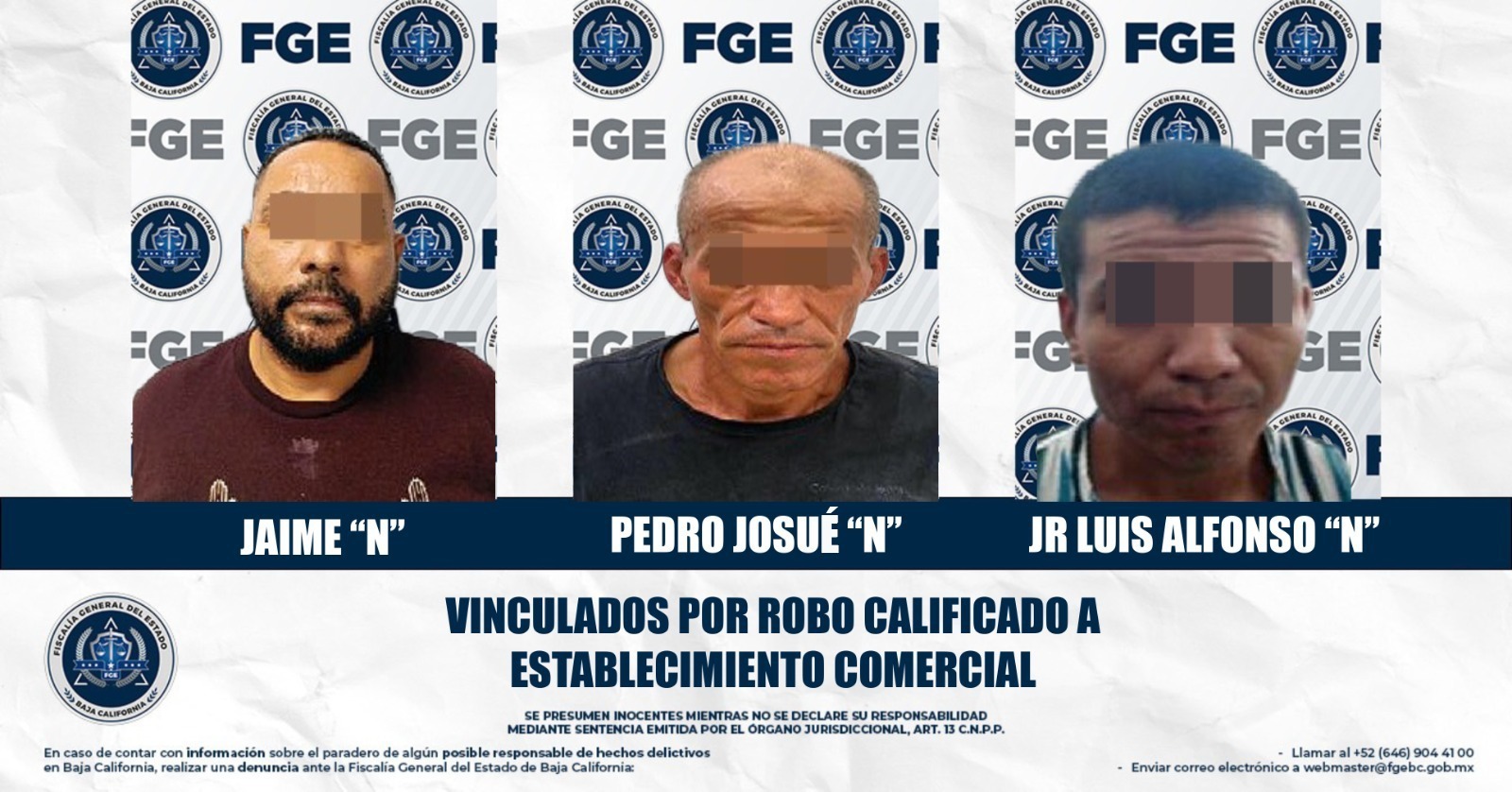 MEXICALI, BAJA CALIFORNIA. - La Fiscalía Regional de Mexicali, a través de la Unidad de Investigación de Delitos con Detenidos Poniente, obtuvo la vinculación a proceso de tres hombres imputados por el delito de robo calificado a establecimiento comercial.