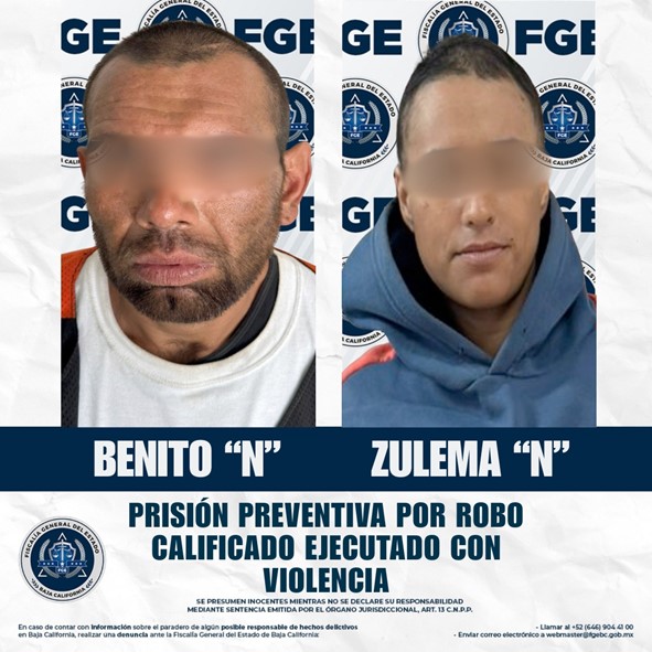 ENSENADA, BAJA CALIFORNIA. - La Fiscalía Regional de Ensenada, a través de la Unidad de Investigación con Detenido, obtuvo la vinculación a proceso de Benito “N” y Zulema “N” por el delito de robo calificado a establecimiento comercial abierto al público, ejecutado con violencia, en grado de tentativa.
