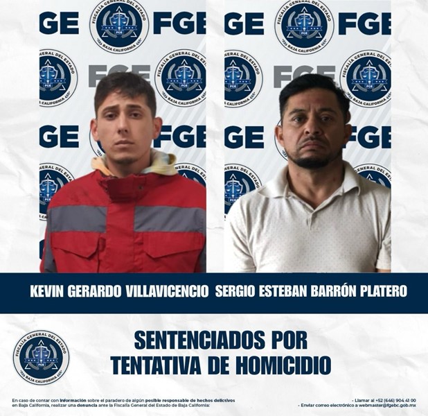 ENSENADA, BAJA CALIFORNIA. - La Fiscalía General del Estado logró una sentencia condenatoria de 13 años y 4 meses de prisión en contra de Sergio Esteban Barrón Platero y Kevin Gerardo Villavicencio, declarados culpables del delito de homicidio calificado con ventaja, en grado de tentativa.