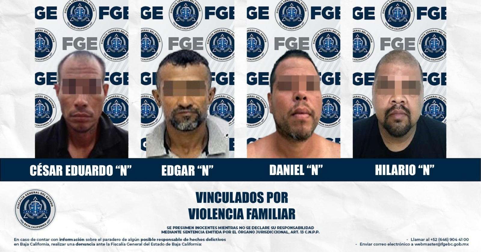MEXICALI, BAJA CALIFORNIA. - La Fiscalía Regional de Mexicali a través de las unidades de Investigación con Detenidos Poniente, Foránea de Guadalupe Victoria y Detenidos Oriente obtuvo la vinculación a proceso de cuatro hombres por el delito de violencia familiar, luego de acreditar con pruebas sólidas su presunta responsabilidad.