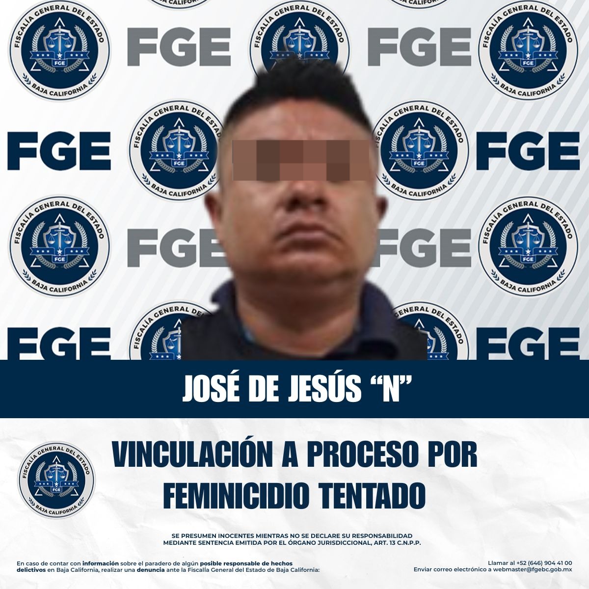 TIJUANA, BAJA CALIFORNIA. - La Unidad de Investigación con Detenido, adscrita a la Fiscalía Regional de Tijuana, obtuvo la vinculación a proceso en contra de José de Jesús “N”, por el delito de feminicidio tentado.