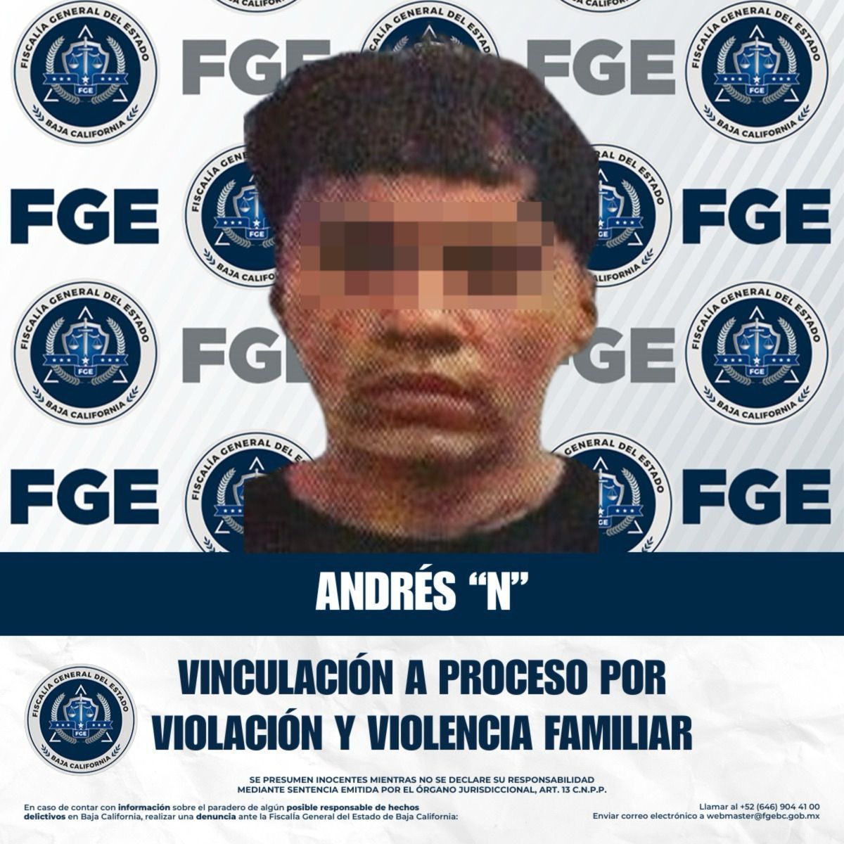 TIJUANA, BAJA CALIFORNIA. - La Fiscalía Especializada en Delitos Contra Mujeres por Razón de Género, a través de la Unidad de Investigación Especializada en Delitos Sexuales, informa que se ha logrado la vinculación a proceso del imputado Andrés “N”, por los delitos de violación, violencia familiar física y psicológica, cometidos en agravio de su pareja.