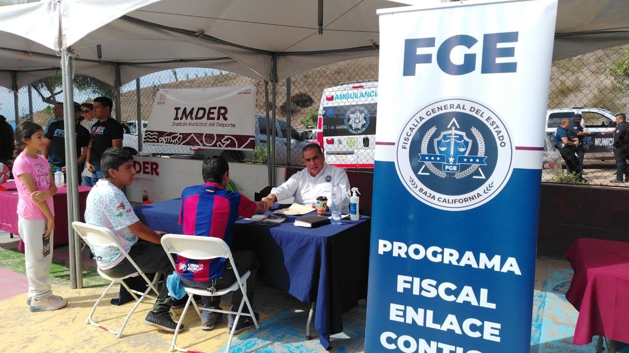 PLAYAS DE ROSARITO, BAJA CALIFORNIA. - Con el objetivo planteado por la Fiscal General del Estado, Dra. Ma. Elena Andrade Ramírez, de acercar los programas de la institución y fortalecer el vínculo con la ciudadanía, la Fiscalía General del Estado (FGE) participó en la Jornada Comunitaria “Nos Toca Hacer Historia”, organizada por el 10mo. Ayuntamiento de Playas de Rosarito, que preside Rocío Adame Muñoz, y que se llevó a cabo este fin de semana en la cancha de futbol rápido de la colonia Colinas del Sol.