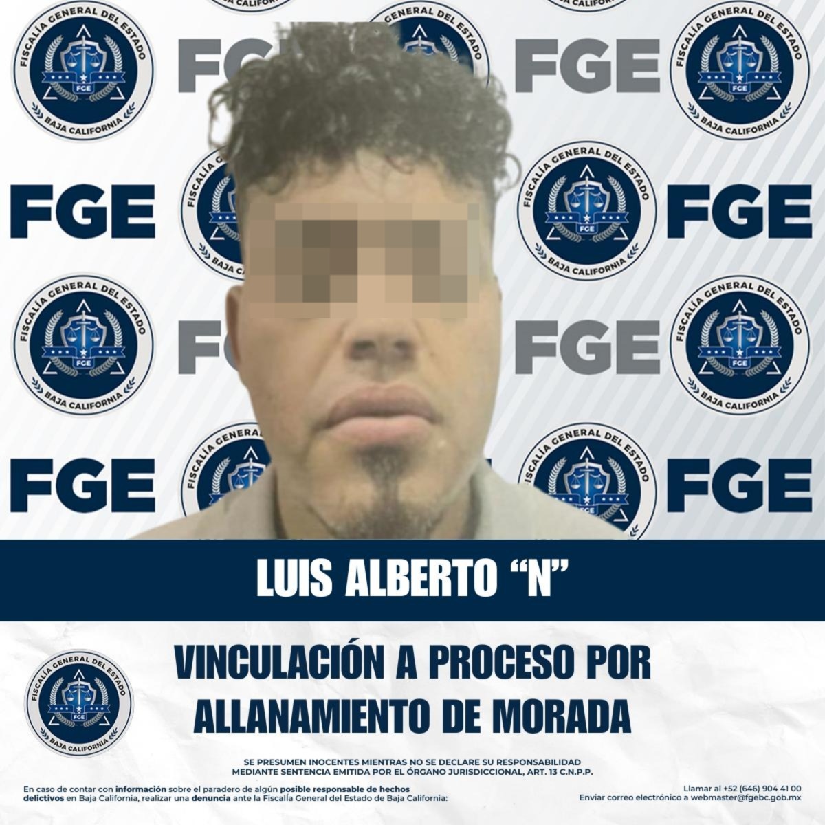 TIJUANA, BAJA CALIFORNIA. - La Fiscalía Regional de Tijuana, a través de la Unidad de Investigación con Detenido, logró la vinculación a proceso de Luis Alberto “N” por el delito de allanamiento de morada, en hechos ocurridos en esta ciudad. El imputado fue asegurado en flagrancia por elementos de la Policía Municipal tras ser señalado de manera directa e inequívoca por la víctima.