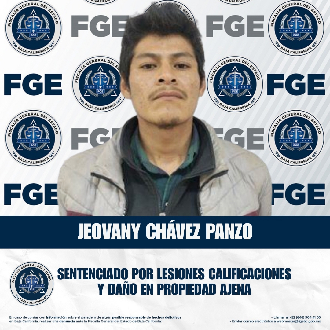 SAN QUINTÍN, BAJA CALIFORNIA. - La Fiscalía Regional de San Quintín obtuvo una sentencia condenatoria de 2 años y 4 meses de prisión en contra de Jeovany Chávez Panzo, por los delitos de lesiones calificadas y daño en propiedad ajena.