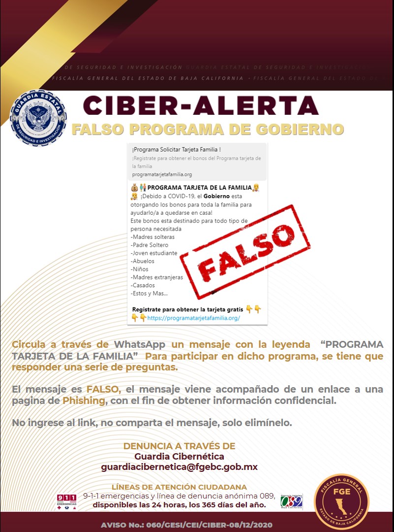 La Fiscalía General del Estado (FGE), emitió una ciberalerta para prevenir a la población, sobre un mensaje fraudulento que circula vía WhatsApp para tramitar apoyos de gobierno mediante el falso programa “Tarjeta de la Familia”.
