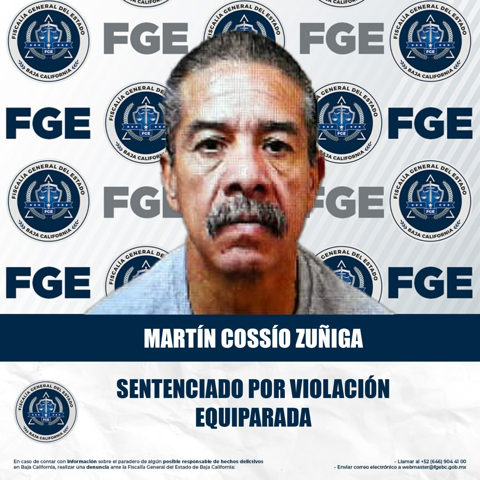 MEXICALI, BAJA CALIFORNIA. - La Fiscalía General del Estado (FGE), a través de la Fiscalía Especializada en Delitos Contra Mujeres por Razón de Género, obtuvo una sentencia condenatoria de 8 años de prisión en contra de Martín Cossío Zúñiga, por el delito de violación equiparada en agravio de una menor.