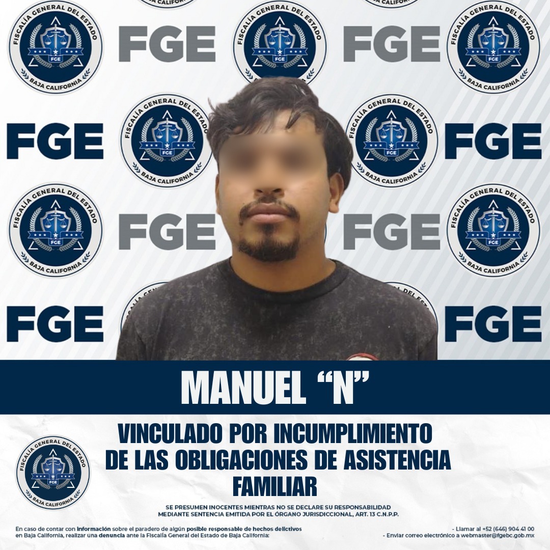 ENSENADA, BAJA CALIFORNIA. - La Fiscalía Regional de Ensenada, a través de la Unidad de Investigación en Maneadero, logró la vinculación a proceso de Manuel “N”, imputado por no cumplir con las obligaciones de asistencia familiar.