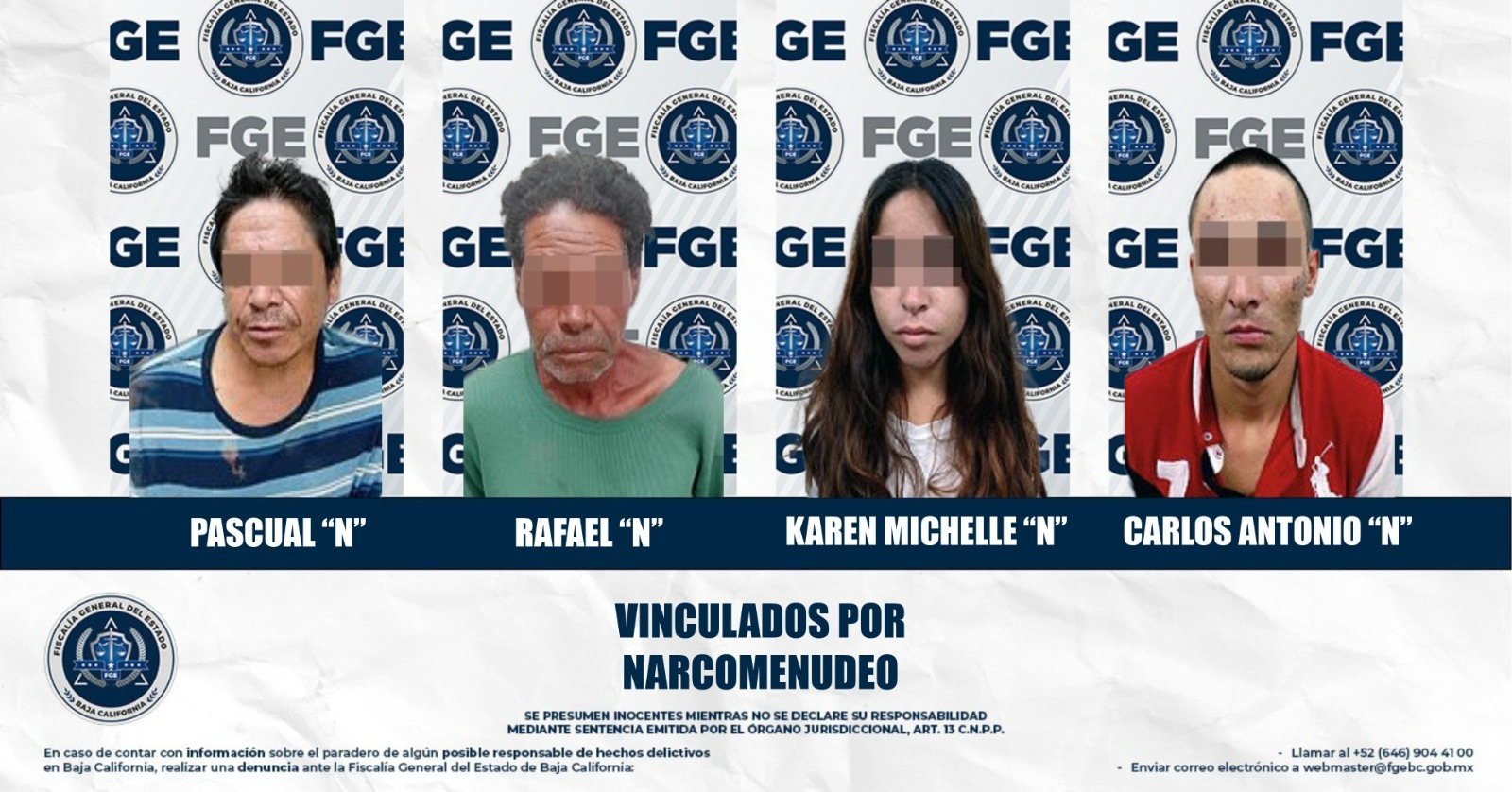 MEXICALI, BAJA CALIFORNIA. - Como parte de las acciones permanentes para combatir el narcomenudeo en la entidad, la Fiscalía General del Estado logró la vinculación a proceso penal de cuatro personas, tras ser presentadas ante el Juez de Control por su presunta responsabilidad en delitos contra la salud.