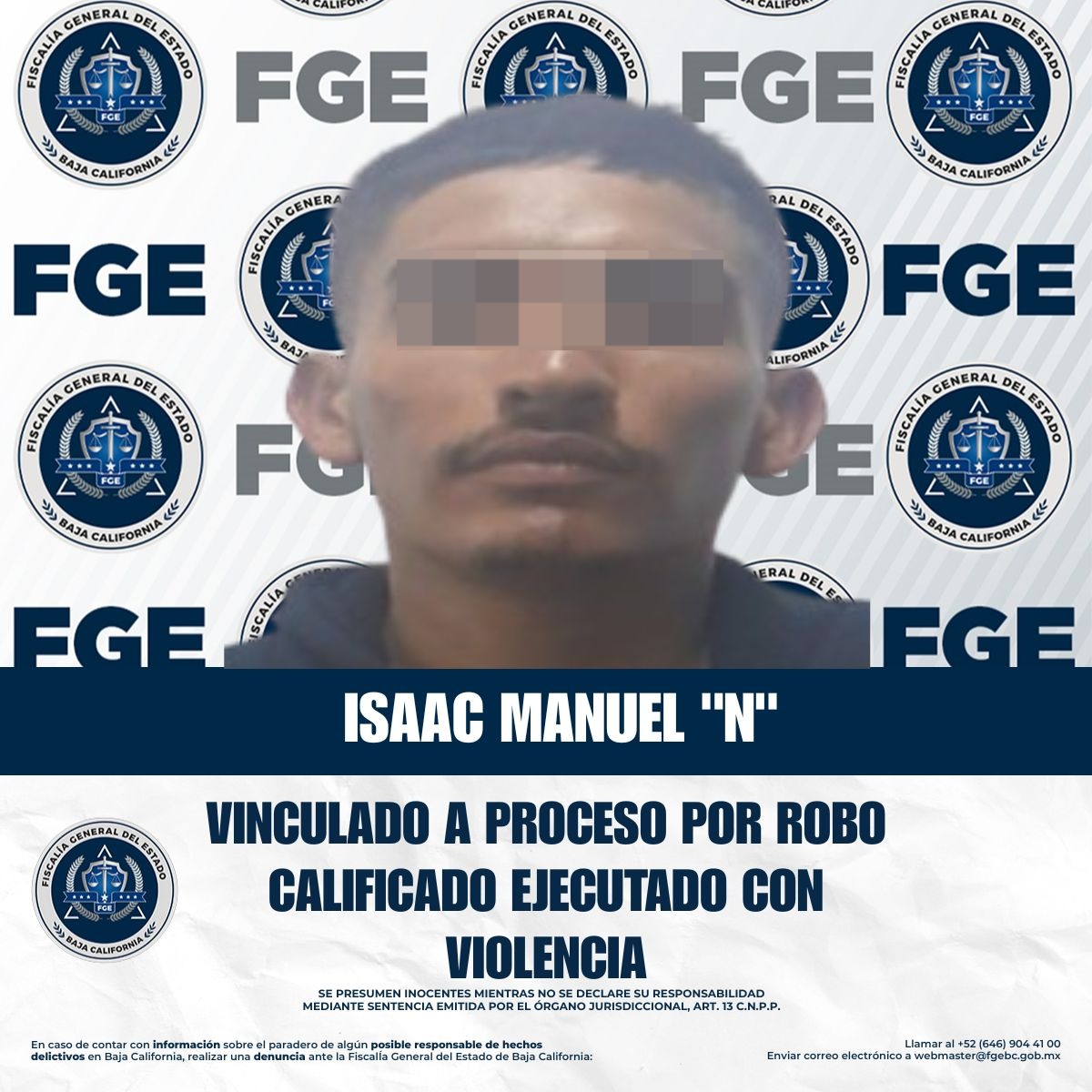 TIJUANA, BAJA CALIFORNIA. - La Unidad de Investigación con Detenido, adscrita a la Fiscalía Regional de Tijuana, obtuvo la vinculación a proceso en contra de Isaac Manuel “N”, por el delito de robo calificado cometido de noche ejecutado con violencia.