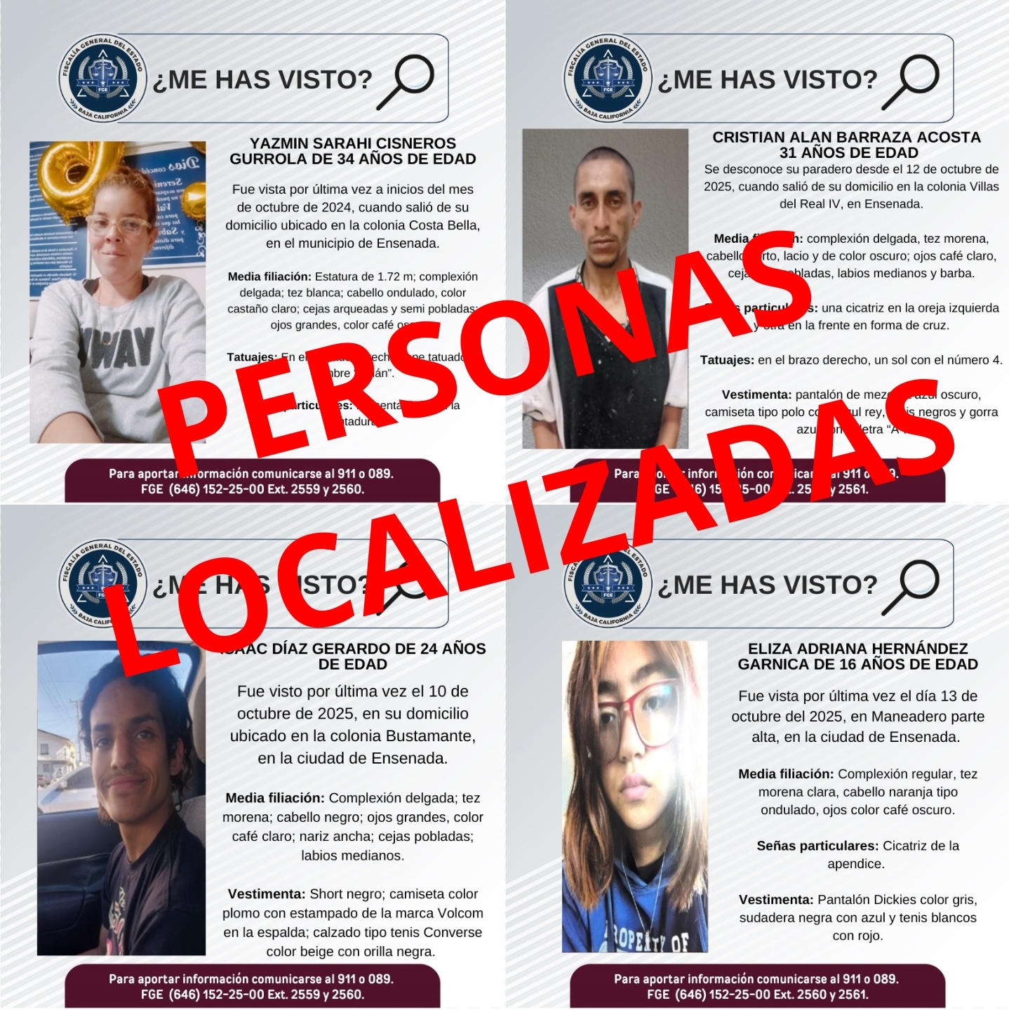 Tras dar seguimiento a las denuncias correspondientes, se implementaron los protocolos de búsqueda con la colaboración de Agentes del Ministerio Público y elementos de la Agencia Estatal de Investigación (AEI), quienes llevaron a cabo diversas diligencias para dar con el paradero de las personas reportadas. Como resultado, se cancelan las pesquisas correspondientes a Yazmín Sarahi Cisneros Gurrola, de 34 años de edad; Cristian Alan Barraza Acosta, de 31 años de edad; Isaac Díaz Gerardo, de 24 años de edad, y a la menor Eliza Adriana Hernández Garnica, de 16 años de edad.