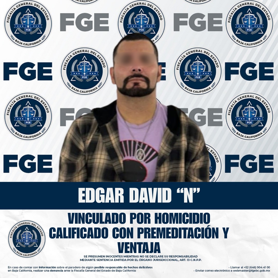 ENSENADA, BAJA CALIFORNIA. - La Fiscalía General del Estado informa que, como resultado de las acciones de investigación realizadas por la Fiscalía Especializada en Delitos Contra la Vida, se logró la aprehensión y posterior vinculación a proceso de Edgar David “N”, alias “El Sorullo”, por su probable responsabilidad en el delito de homicidio calificado con premeditación y ventaja, cometido en agravio de una persona del sexo masculino en la ciudad de Ensenada.