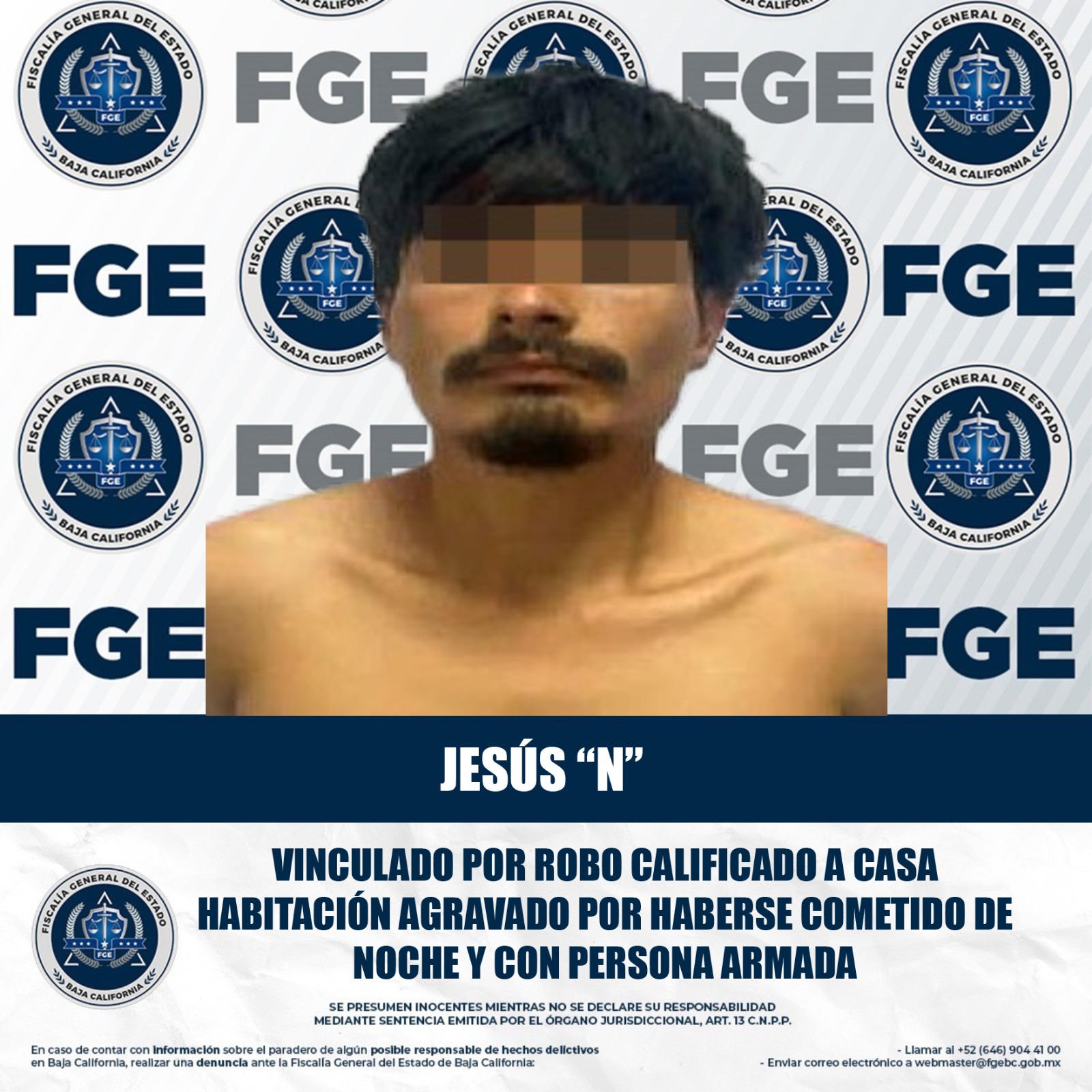 MEXICALI, BAJA CALIFORNIA. - Después de presentar la carpeta de investigación con elementos contundes, la Fiscalía Regional de Mexicali, logró la vinculación a proceso de un acusado por el delito de robo calificado a casa habitación con violencia agravada por haber sido cometido de noche con persona armada.