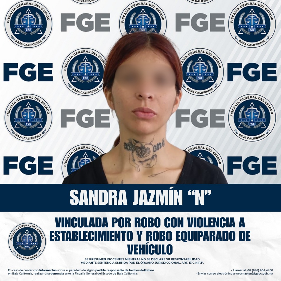 ENSENADA, BAJA CALIFORNIA. - Como resultado de las investigaciones realizadas por la Fiscalía Regional de Ensenada, una mujer identificada como Sandra Jazmín “N” fue llevada ante el Juez de Control por su probable participación en dos hechos delictivos diferentes, uno por robo con violencia en un establecimiento comercial y otro por robo equiparado de vehículo en modalidad de venta.