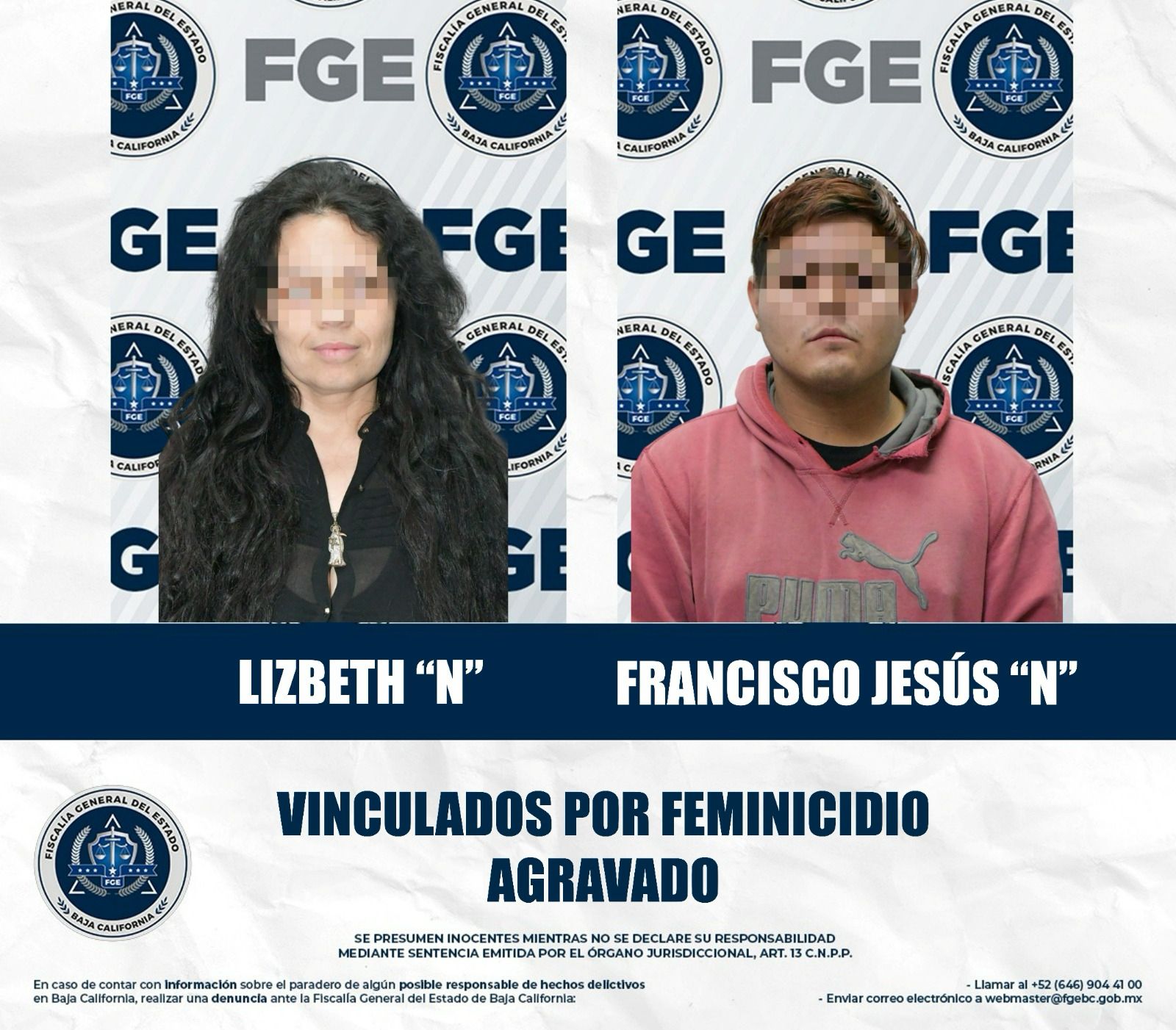 MEXICALI, BAJA CALIFORNIA. - Por el delito de feminicidio agravado, la Fiscalía General del Estado (FGE) obtuvo del Juez de Control el auto de vinculación a proceso en contra de Lizbeth “N”, alias “La Guerra”, y Francisco Jesús “N”, señalados como presuntos responsables de la muerte de una mujer de la tercera edad.