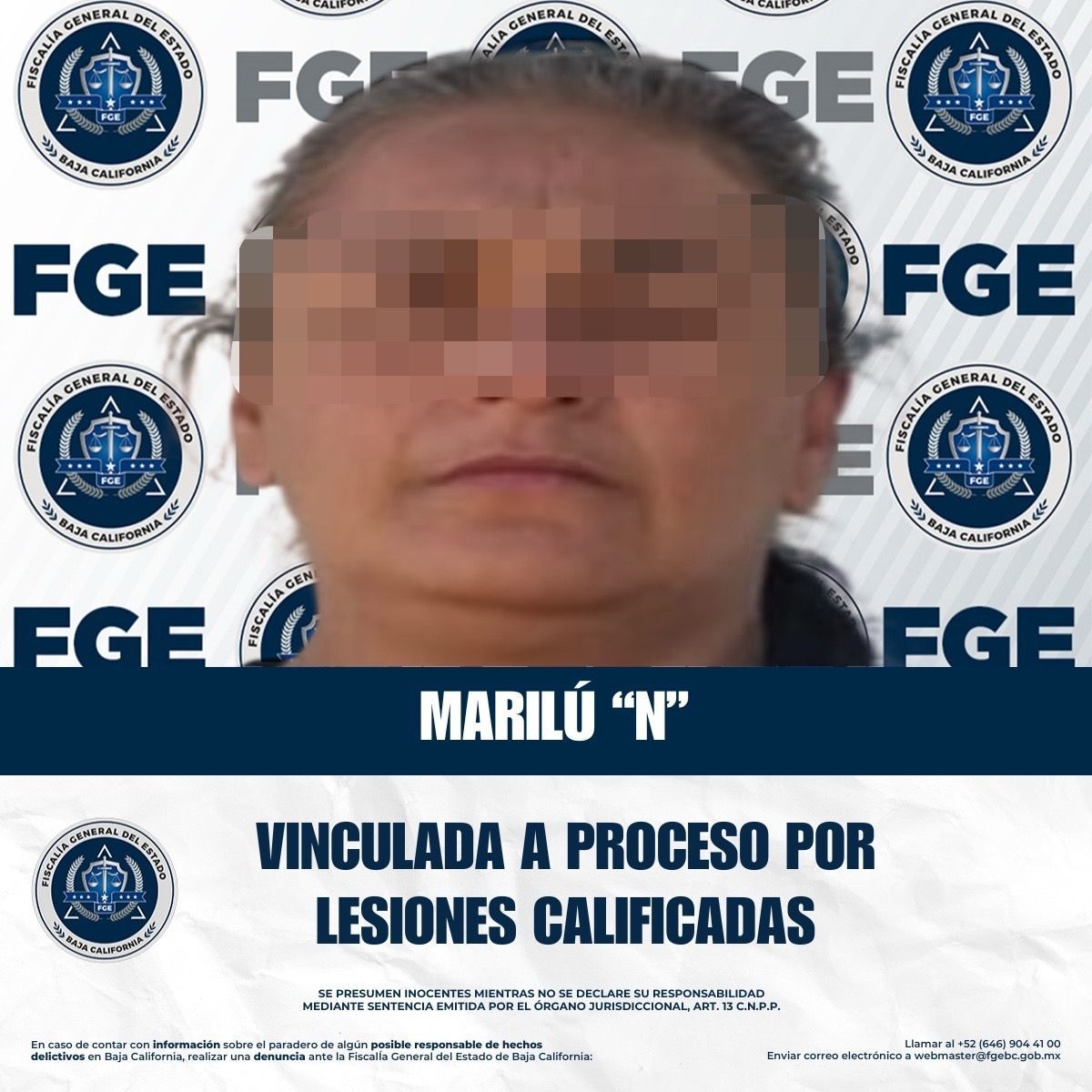 TIJUANA, BAJA CALIFORNIA. - La Fiscalía General del Estado, a través de la Fiscalía Regional de Tijuana y del trabajo realizado por la Unidad de Investigación con Detenido, obtuvo auto de vinculación a proceso en contra de Marilú “N” por su probable responsabilidad en el delito de lesiones calificadas.