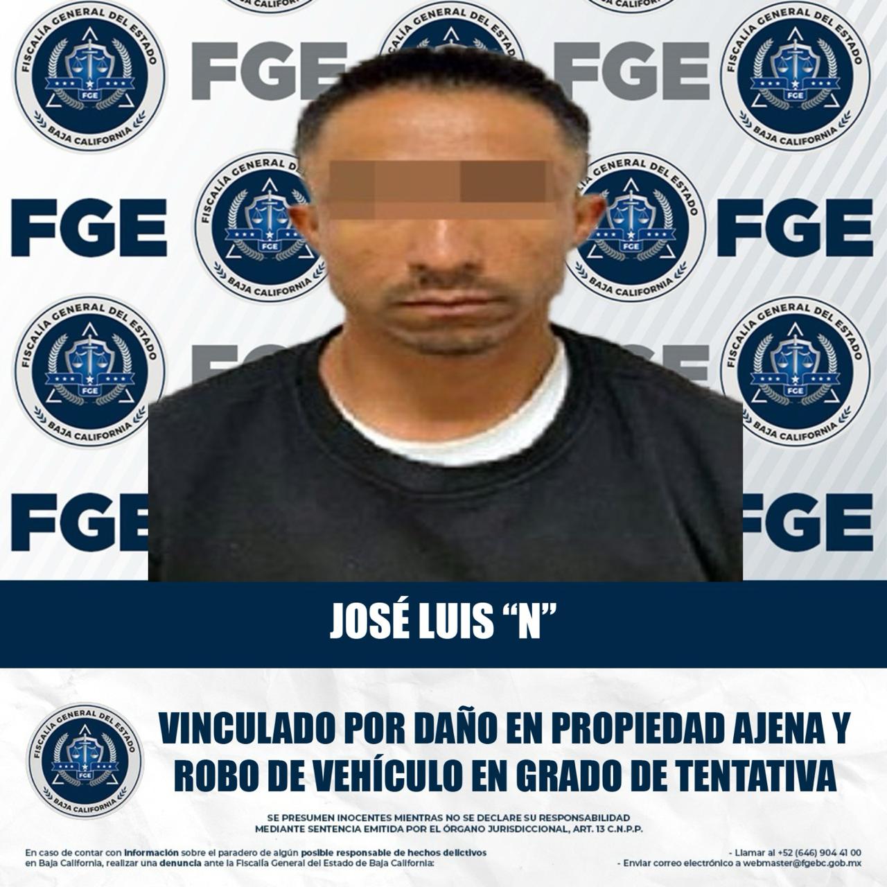 MEXICALI, BAJA CALIFORNIA. - La Fiscalía General del Estado, a través de la Fiscalía Regional de Mexicali, obtuvo auto de vinculación a proceso y la medida cautelar de prisión preventiva justificada en contra de José Luis “N”, por su probable responsabilidad en los delitos de daño en propiedad ajena y robo de vehículo en grado de tentativa.