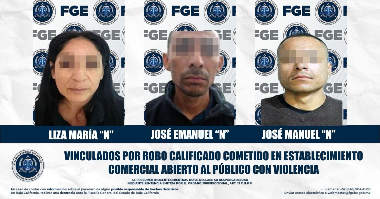 MEXICALI, BAJA CALIFORNIA. - La Fiscalía Regional de Mexicali, a través de las unidades de Investigación de Delitos con Detenidos Oriente, Robos Poniente, y Robos Oriente, obtuvo la vinculación a proceso de tres personas imputadas por el delito de robo calificado cometido en establecimiento comercial abierto al público con violencia.