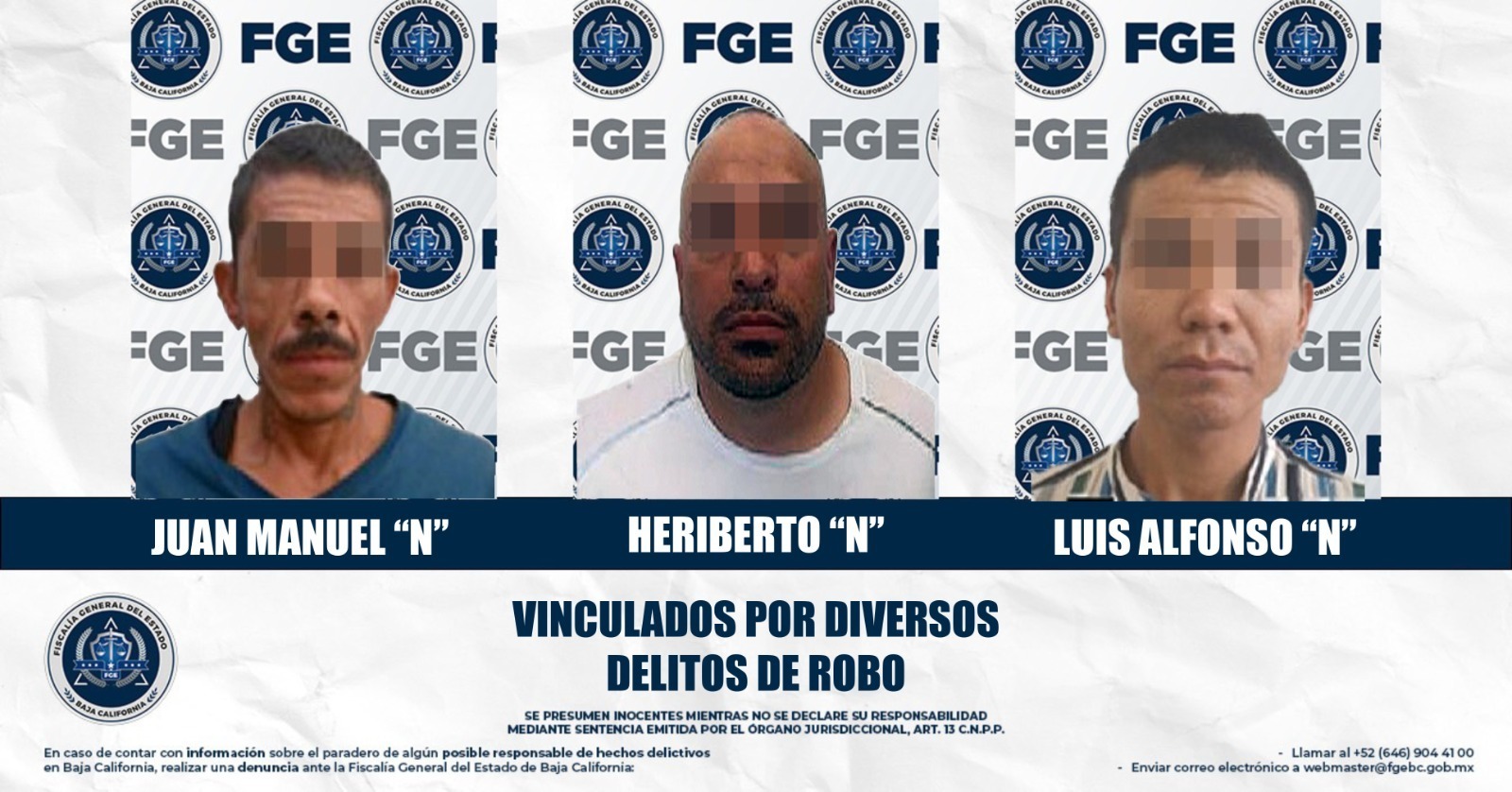 MEXICALI, BAJA CALIFORNIA. - La Fiscalía Regional de Mexicali, a través de las Unidades de Investigación de Delitos con Detenidos Poniente y Delitos de Robo Poniente, obtuvo la vinculación a proceso de tres hombres imputados por los delitos de robo y robo calificado cometido a establecimiento comercial abierto al público.