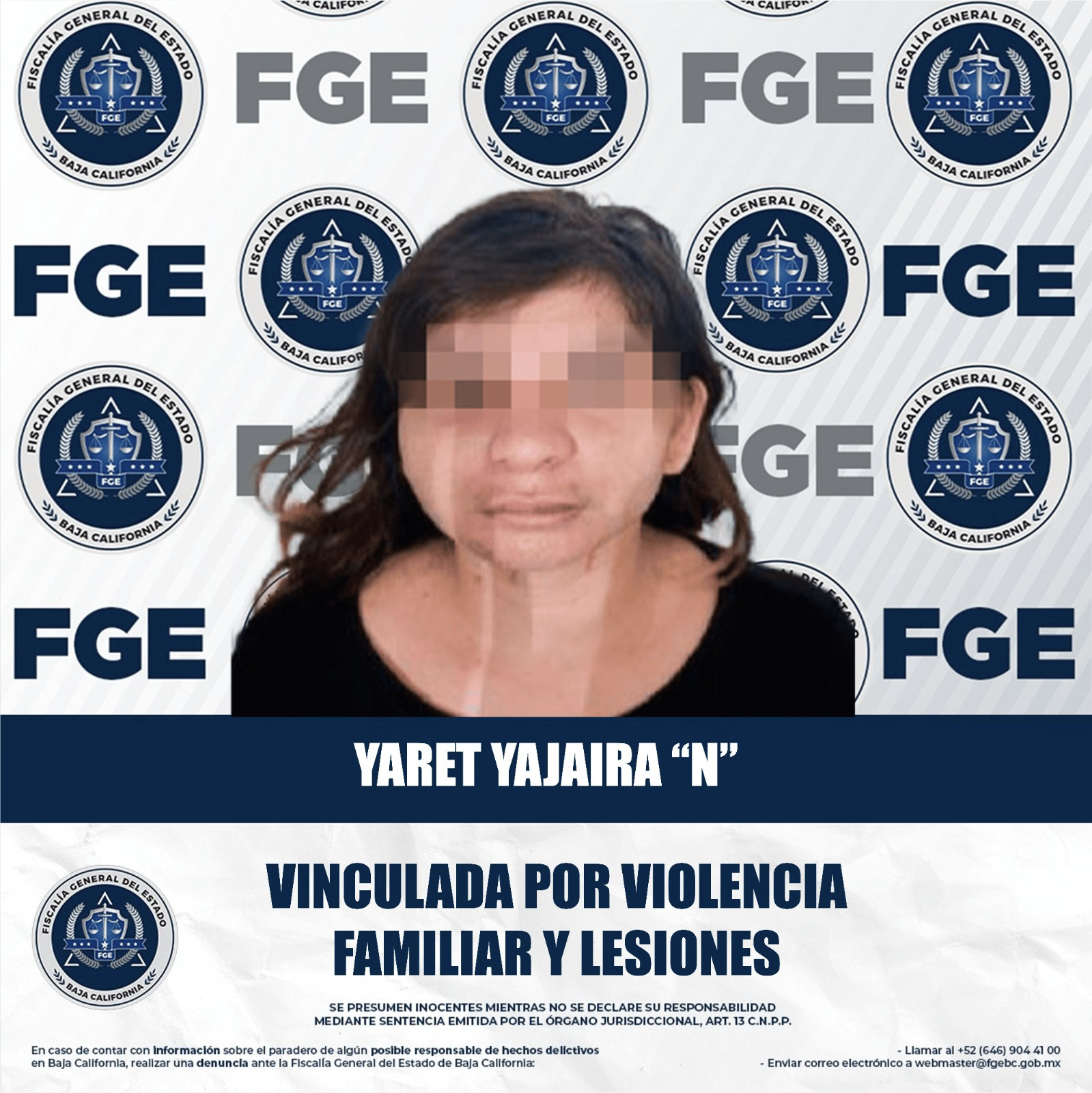 MEXICALI, BAJA CALIFORNIA. - La Fiscalía Regional de Mexicali, a través de la Unidad de Investigación Foránea de Ciudad Morelos, obtuvo la vinculación a proceso de Yaret Yajaira “N” por su probable responsabilidad en la comisión de los delitos de violencia familiar y lesiones agravadas por razón de parentesco.