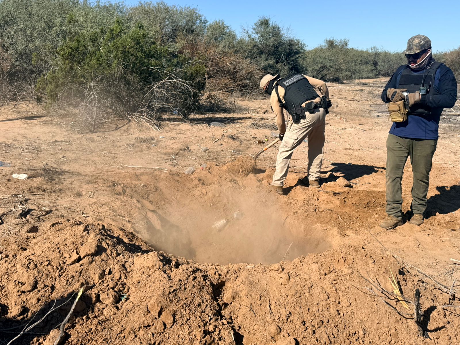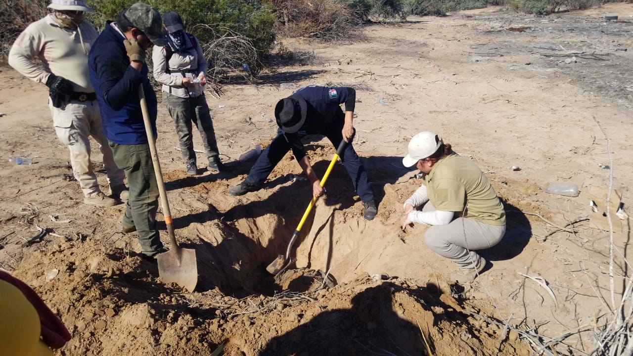 De manera simultánea, se desarrollaron labores de búsqueda en campo en la zona desértica del ejido Nezahualcóyotl, con la participación de personal especializado de la Fiscalía General del Estado y de los colectivos. Durante esta jornada se realizaron recorridos por cuadrantes en amplias áreas, así como la inspección de puntos de interés que presentaban remociones de tierra, variaciones en el color del suelo o alteraciones visibles. Además, se contó con el apoyo de un binomio canino especializado en la localización de restos humanos y óseos.