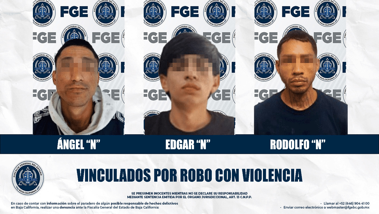MEXICALI, BAJA CALIFORNIA. - La Fiscalía Regional de Mexicali obtuvo la vinculación a proceso de tres hombres acusados de participar en distintos robos con violencia cometidos en establecimientos comerciales y en perjuicio de un conductor de taxi.