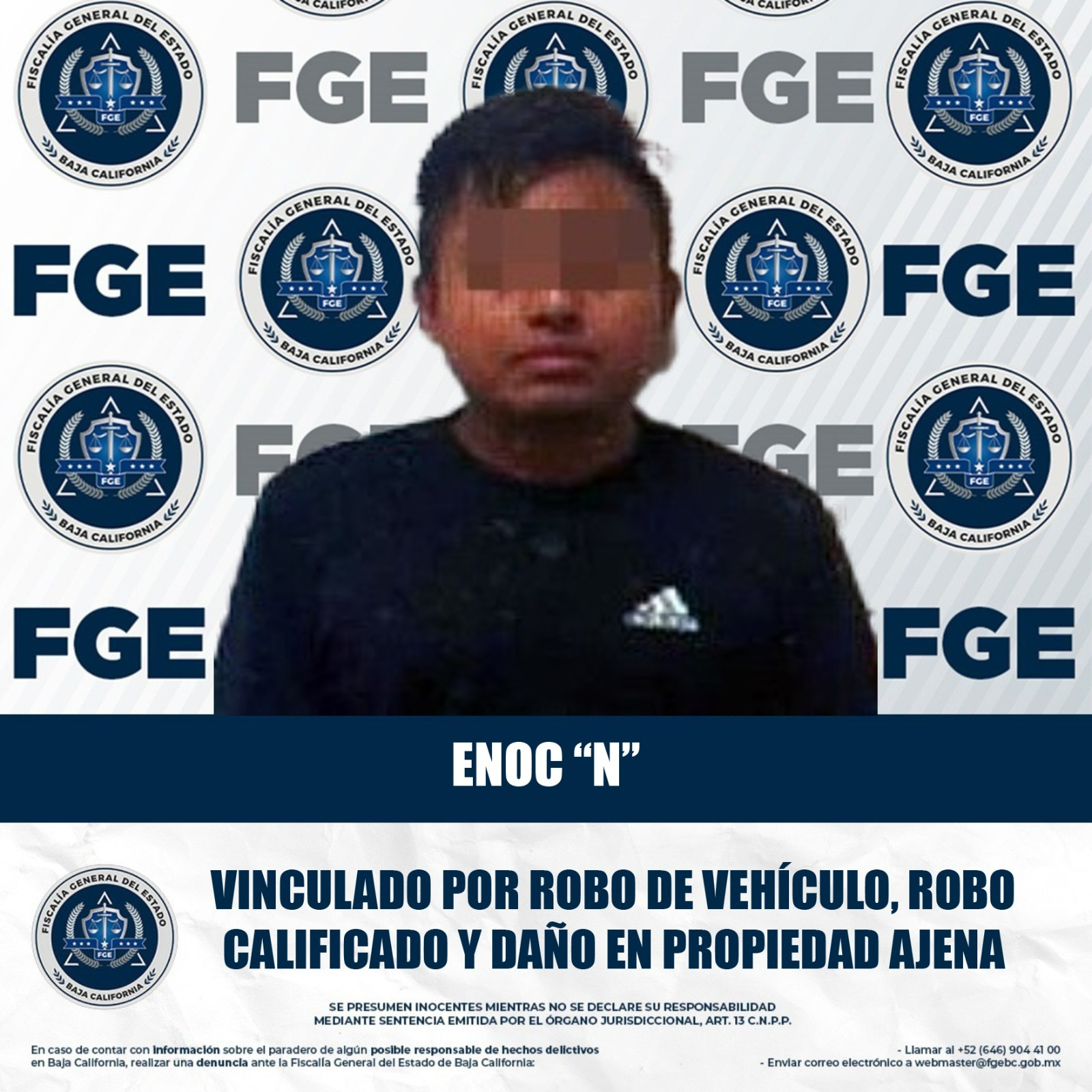 MEXICALI, BAJA CALIFORNIA. - La Fiscalía Regional de Mexicali, a través de la Unidad de Investigación de Robo de Vehículo Oriente, logró la vinculación a proceso de Enoc “N” por su presunta responsabilidad en los delitos de robo de vehículo con violencia, robo calificado cometido en perjuicio de persona mayor de 60 años y daños en propiedad ajena por culpa.