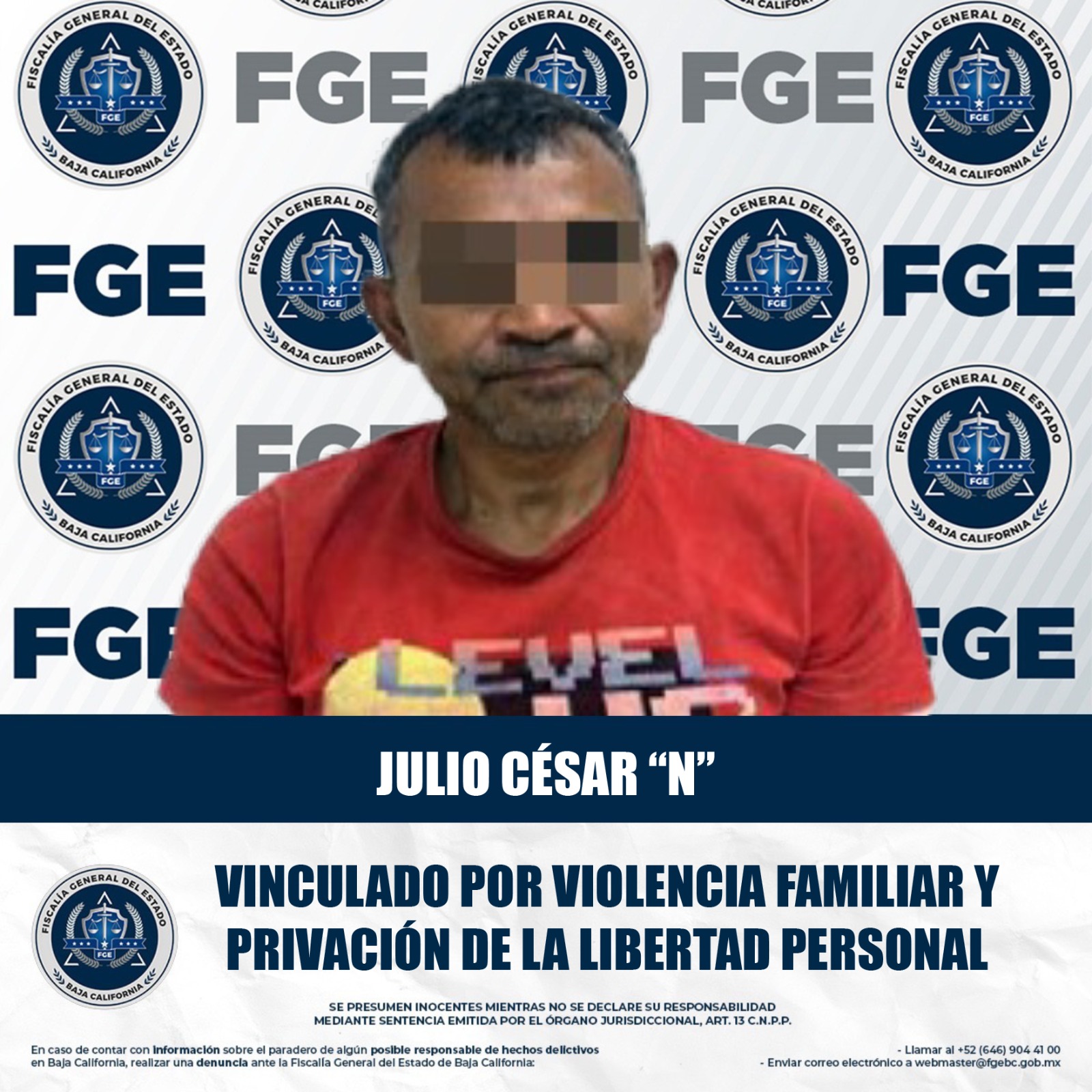 MEXICALI, BAJA CALIFORNIA. - La Fiscalía Regional de Mexicali obtuvo, como resultado de la correcta integración de la carpeta de investigación, el inicio de un proceso penal de Julio César "N", imputado de los delitos de violencia familiar y privación de la libertad personal.