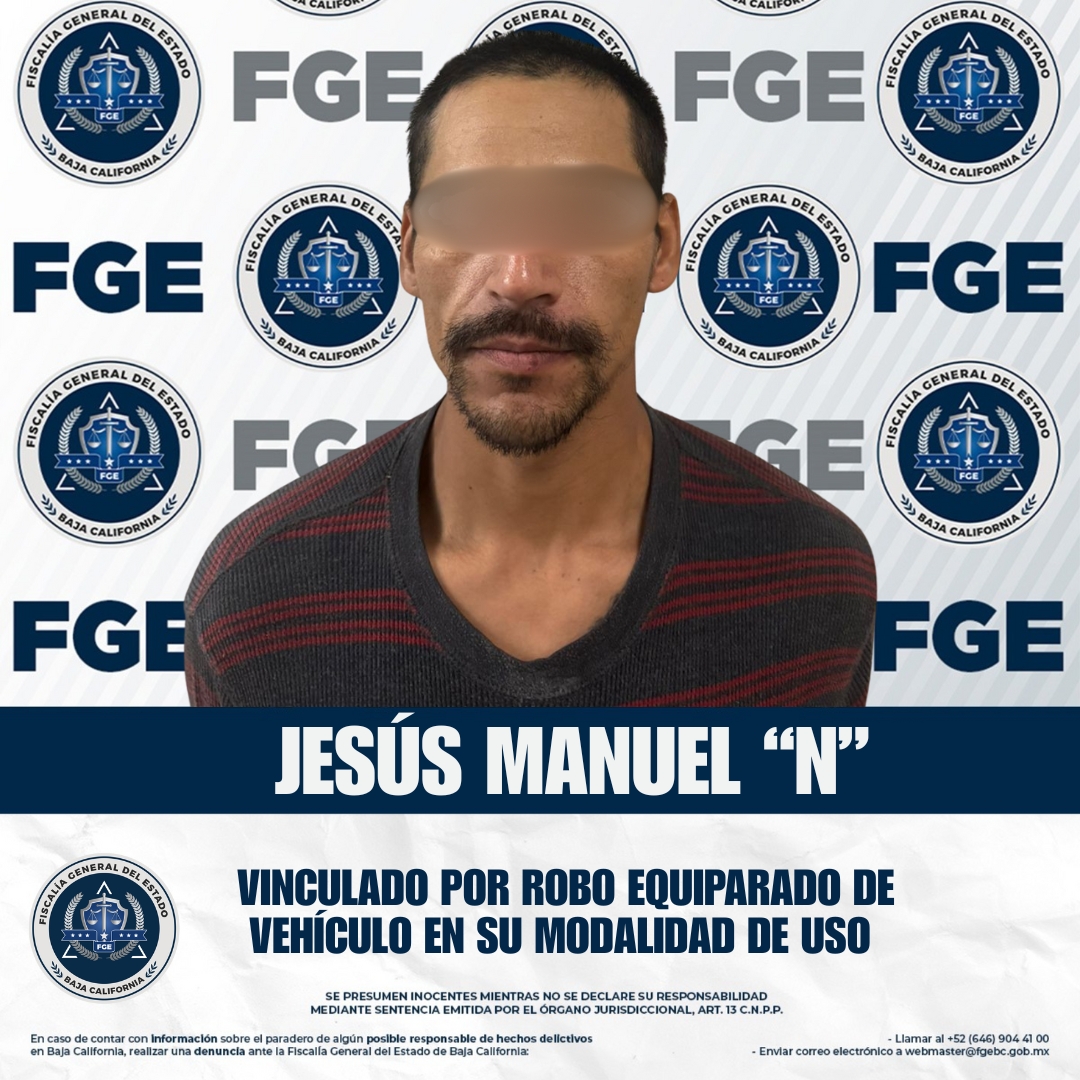 ENSENADA, BAJA CALIFORNIA. - La Fiscalía Regional de Ensenada, a través de la Unidad de Investigación de Robo de Vehículos, logró la vinculación a proceso de Jesús Manuel “N” por el delito de robo equiparado de vehículo en la modalidad de uso.
