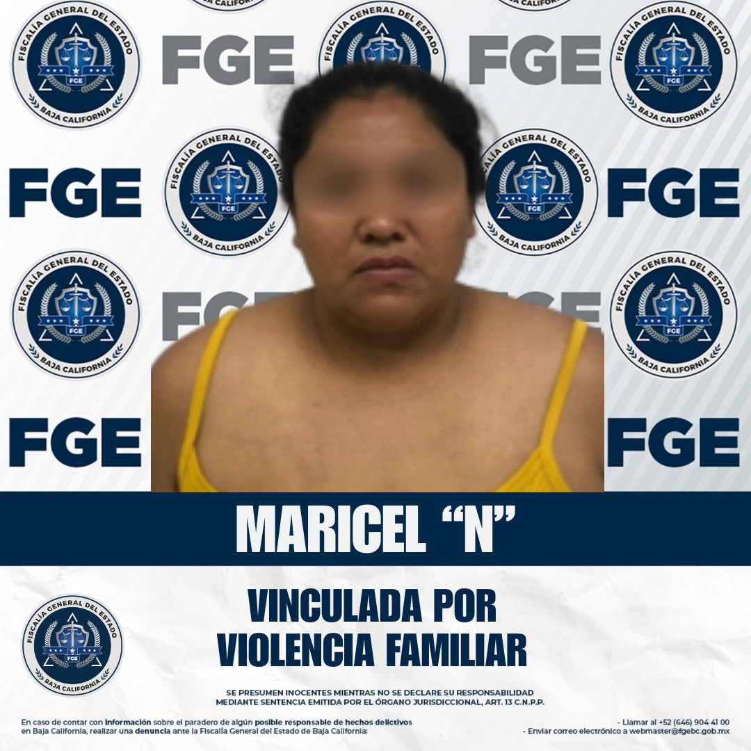 SAN QUINTÍN, BAJA CALIFORNIA. - La Fiscalía General del Estado obtuvo la vinculación a proceso de Maricel “N”, de 30 años, por el delito de violencia familiar en la modalidad de violencia física, en San Quintín.
