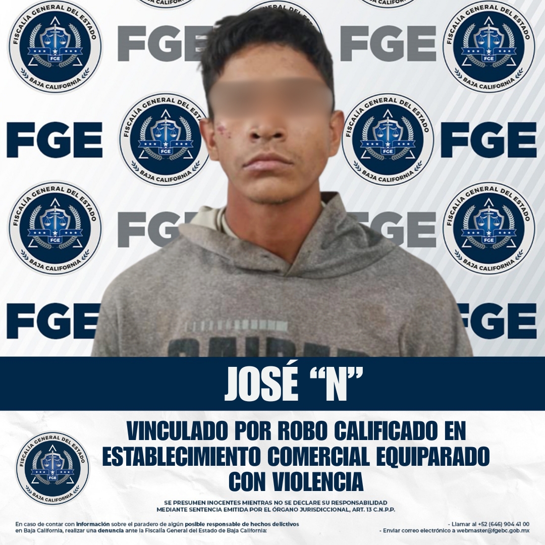 ENSENADA, BAJA CALIFORNIA. - La Fiscalía Regional de Ensenada, a través de la Unidad de Investigación con Detenido, obtuvo la vinculación a proceso de José “N” por el delito de robo calificado en establecimiento comercial ejecutando violencia, tras una intervención oportuna que permitió esclarecer los hechos y asegurar su detención.