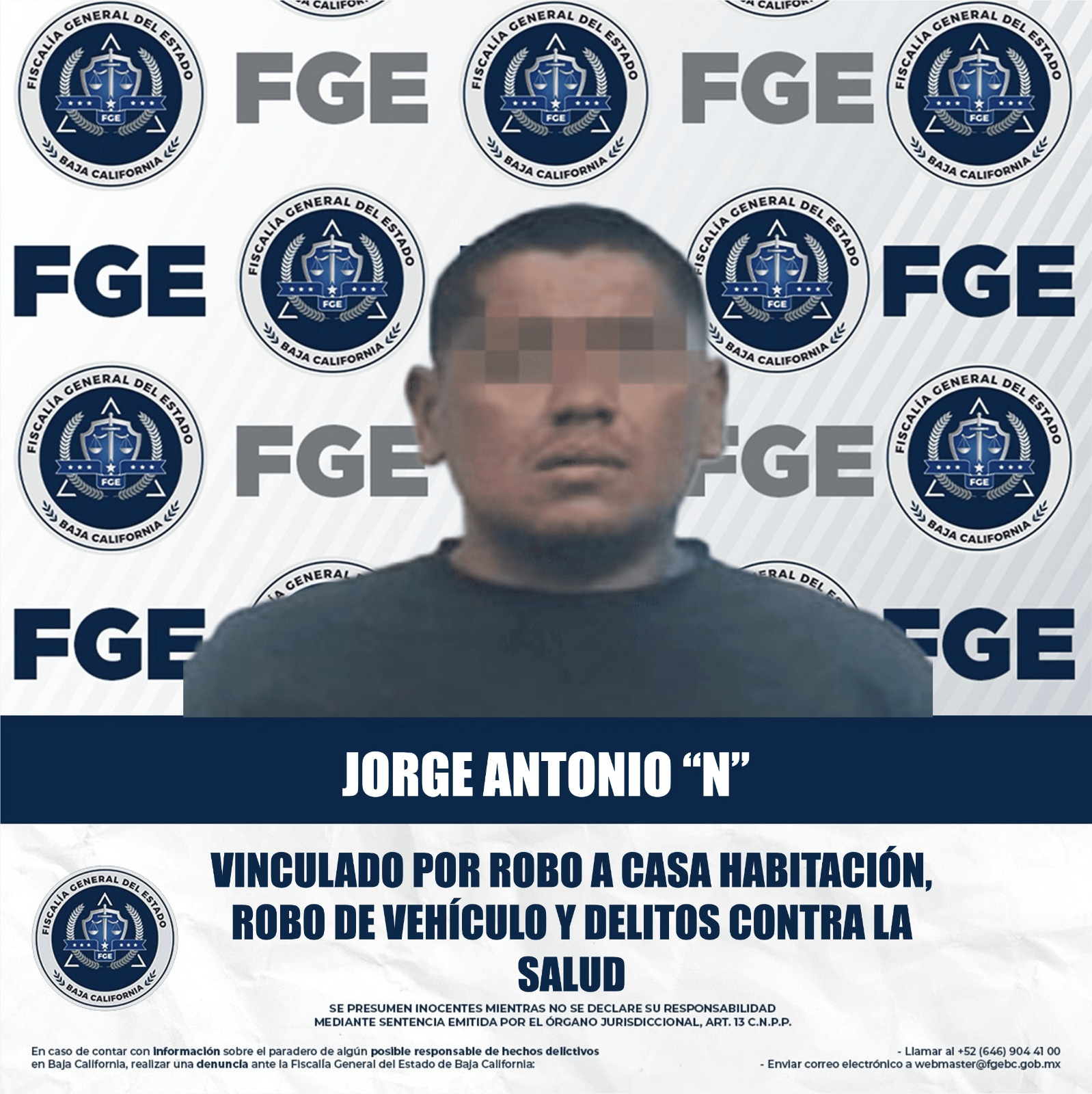 MEXICALI, BAJA CALIFORNIA. - La Fiscalía Regional de Mexicali obtuvo la vinculación a proceso de Jorge Antonio “N”, acusado de los delitos de robo calificado a casa habitación, robo de vehículo con violencia y delitos contra la salud.