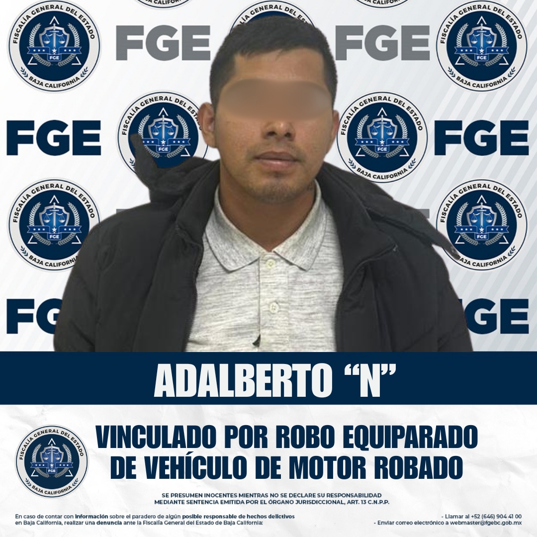 SAN QUINTÍN, BAJA CALIFORNIA. - La Fiscalía Regional de San Quintín, a través de la Unidad de Investigación, obtuvo la vinculación de Adalberto “N” por el delito de robo equiparado de vehículo de motor robado.