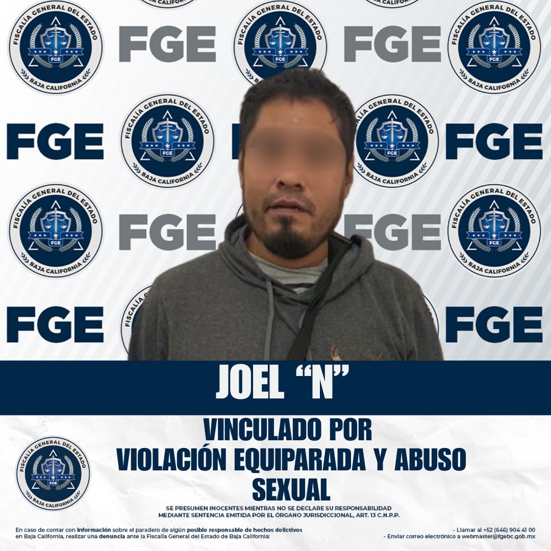 ENSENADA, BAJA CALIFORNIA. - La Fiscalía Regional de Ensenada informó que, mediante los datos de prueba presentados por el Ministerio Público, se logró la vinculación a proceso de Joel “N” por los delitos de violación equiparada agravada y abuso sexual a menores agravado, presuntamente cometidos contra una menor de edad.