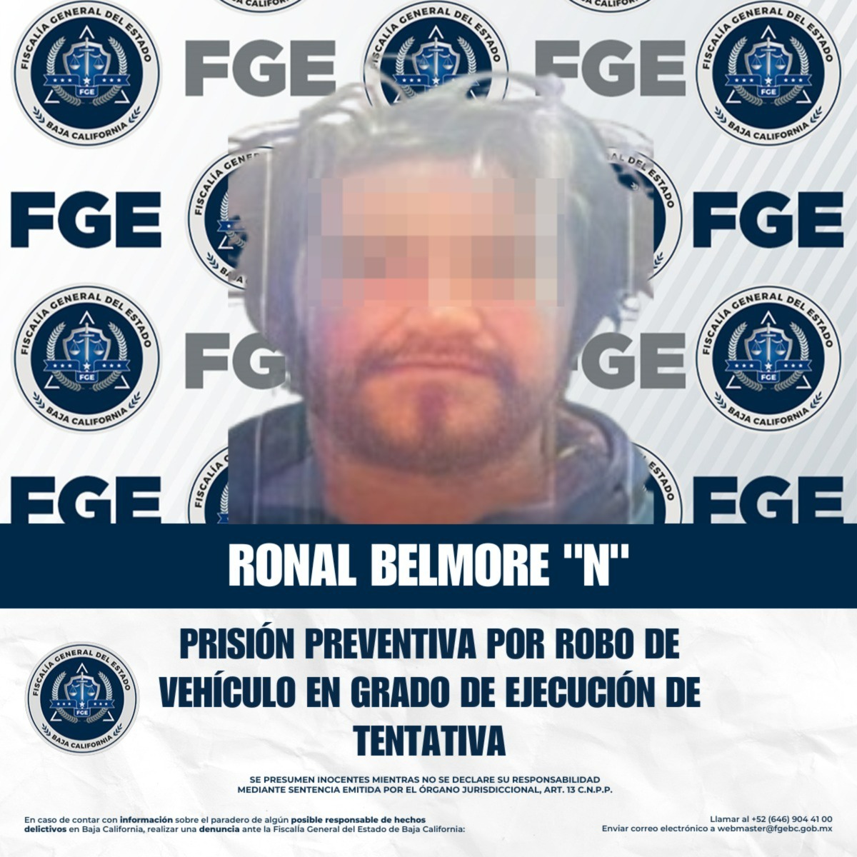 TIJUANA, BAJA CALIFORNIA. - La Unidad de Investigación con Detenidos, adscrita a la Fiscalía Regional de Tijuana, obtuvo la vinculación a proceso y la medida cautelar de prisión preventiva justificada en contra de Ronal Belmore “N” por el delito de robo de vehículo en grado de ejecución de tentativa.