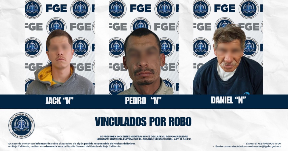 ENSENADA, BAJA CALIFORNIA. - La Fiscalía Regional de Ensenada informa que, tras las investigaciones correspondientes, se obtuvo la vinculación a proceso y la imposición de medidas cautelares de prisión preventiva contra tres personas detenidas por delitos de robo en distintos hechos ocurridos en la ciudad.