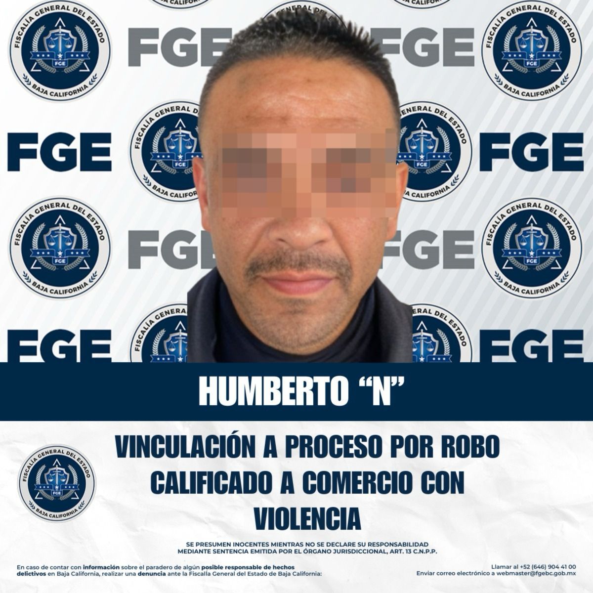 TIJUANA, BAJA CALIFORNIA. - La Fiscalía Regional de Tijuana, a través del Ministerio Público de la Unidad de Investigación Especializada en Robos, Zona Centro, logró la vinculación a proceso de Humberto "N" por su presunta participación en el delito de robo calificado a comercio ejecutado con violencia.