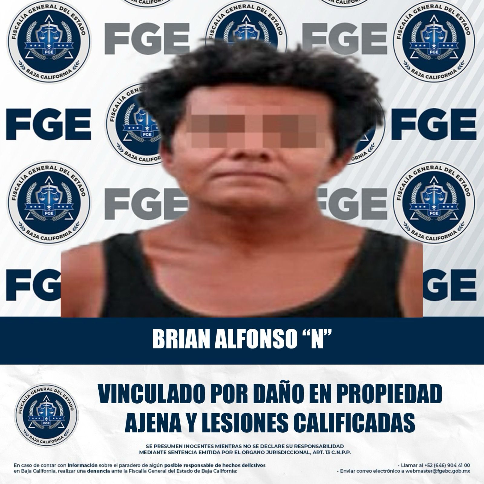 MEXICALI, BAJA CALIFORNIA. - La Fiscalía Regional de Mexicali, a través de la Unidad de Investigación con Detenido Poniente, obtuvo la vinculación a proceso de un hombre por su presunta responsabilidad en los delitos de daño en propiedad ajena y lesiones calificadas.