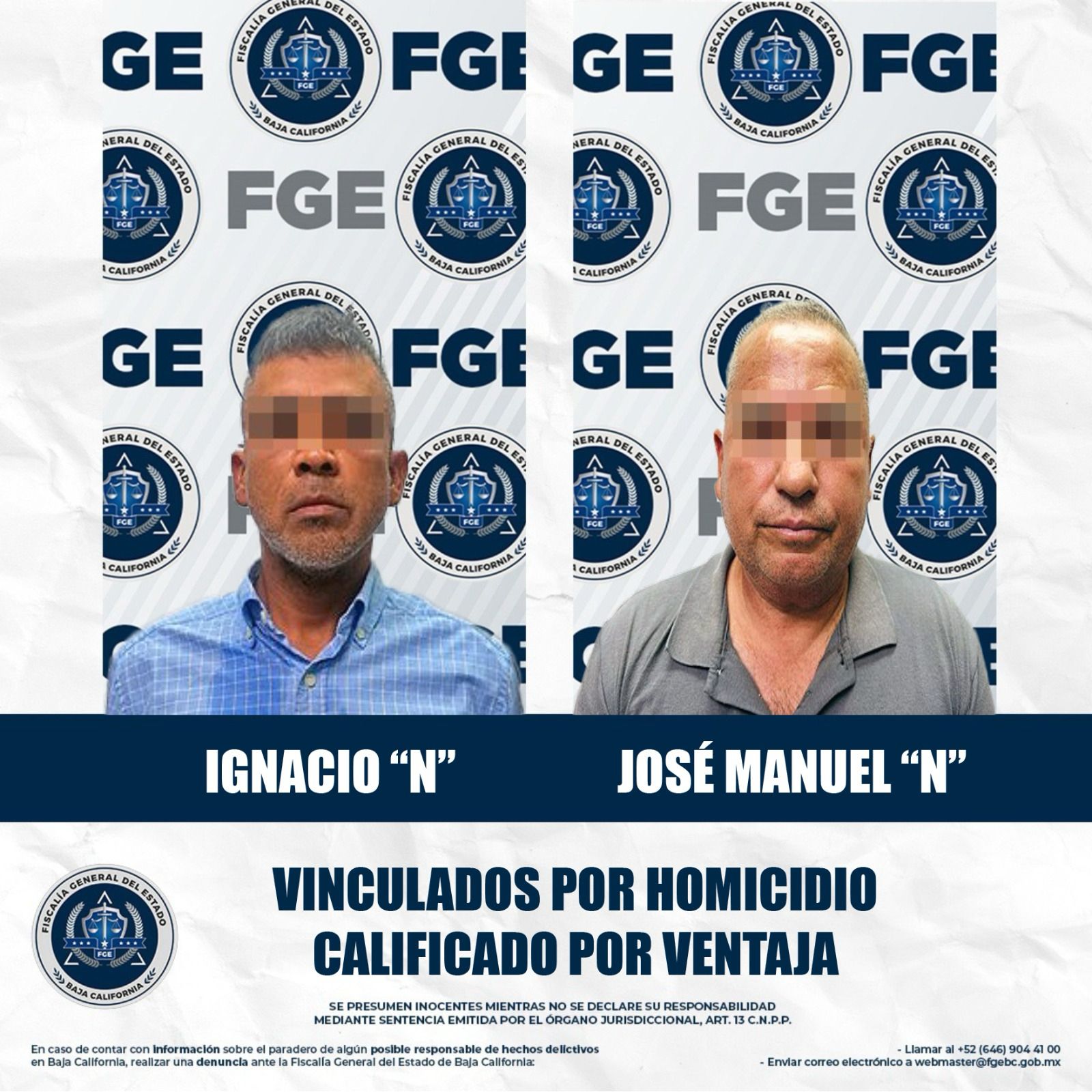 MEXICALI, BAJA CALIFORNIA. - La Fiscalía General del Estado, a través de la Fiscalía Especializada en Delitos Contra la Vida, obtuvo la vinculación a proceso de Ignacio “N” alias “El Camaronero” y José Manuel “N” alias “El Panadero”, por su presunta participación en el delito de homicidio calificado con ventaja, ocurrido en septiembre de 2024.
